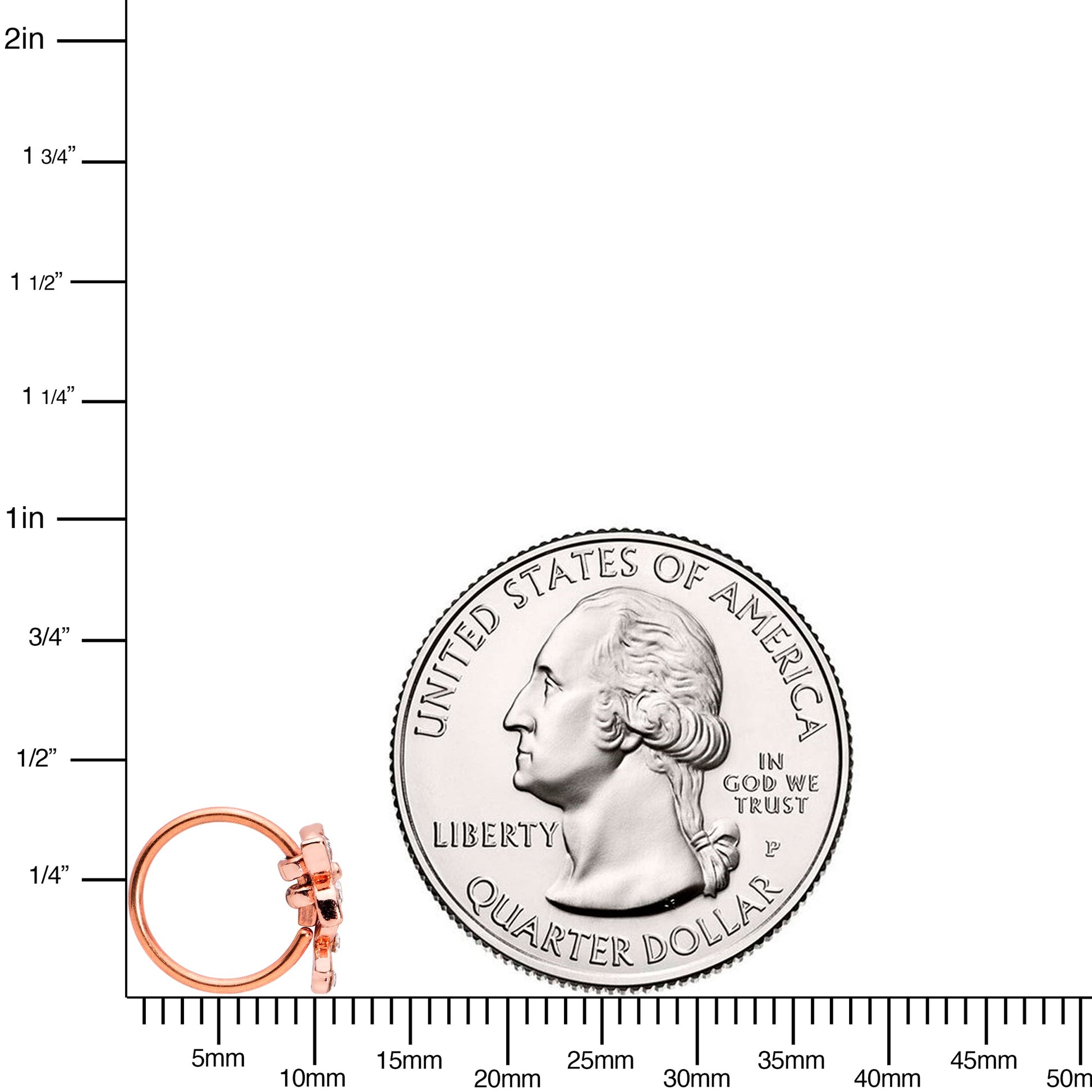 This 20 gauge nostril ring has given the butterfly a perfect spot to land! It's made with an 8mm rose gold tone PVD over 316L surgical grade stainless steel circular ring. It features a butterfly charm embellished with clear gems perched next to a matching flower also set with two clear gems. Once this beautiful butterfly lands in your nose piercing, you'll never want it to leave!Specifications