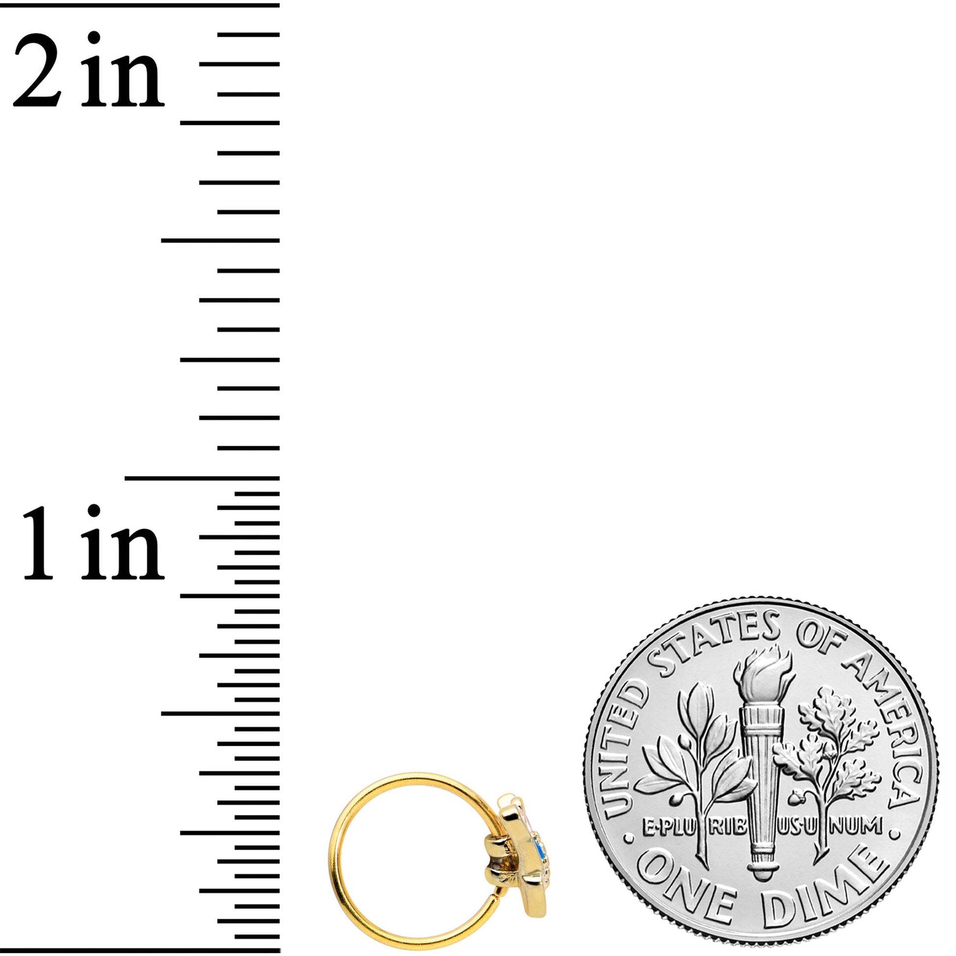 Brighten your look with this 20 gauge nostril ring! It's made with an 8mm gold tone PVD over 316L surgical grade stainless steel circular ring. It features a vividly color butterfly charm. The butterfly has textured detailing down the center and features wildly colorful rainbow-edged wings. Perfect for Pride month or any month, this butterfly nose piercing ring is sure to keep your look bright!Specifications