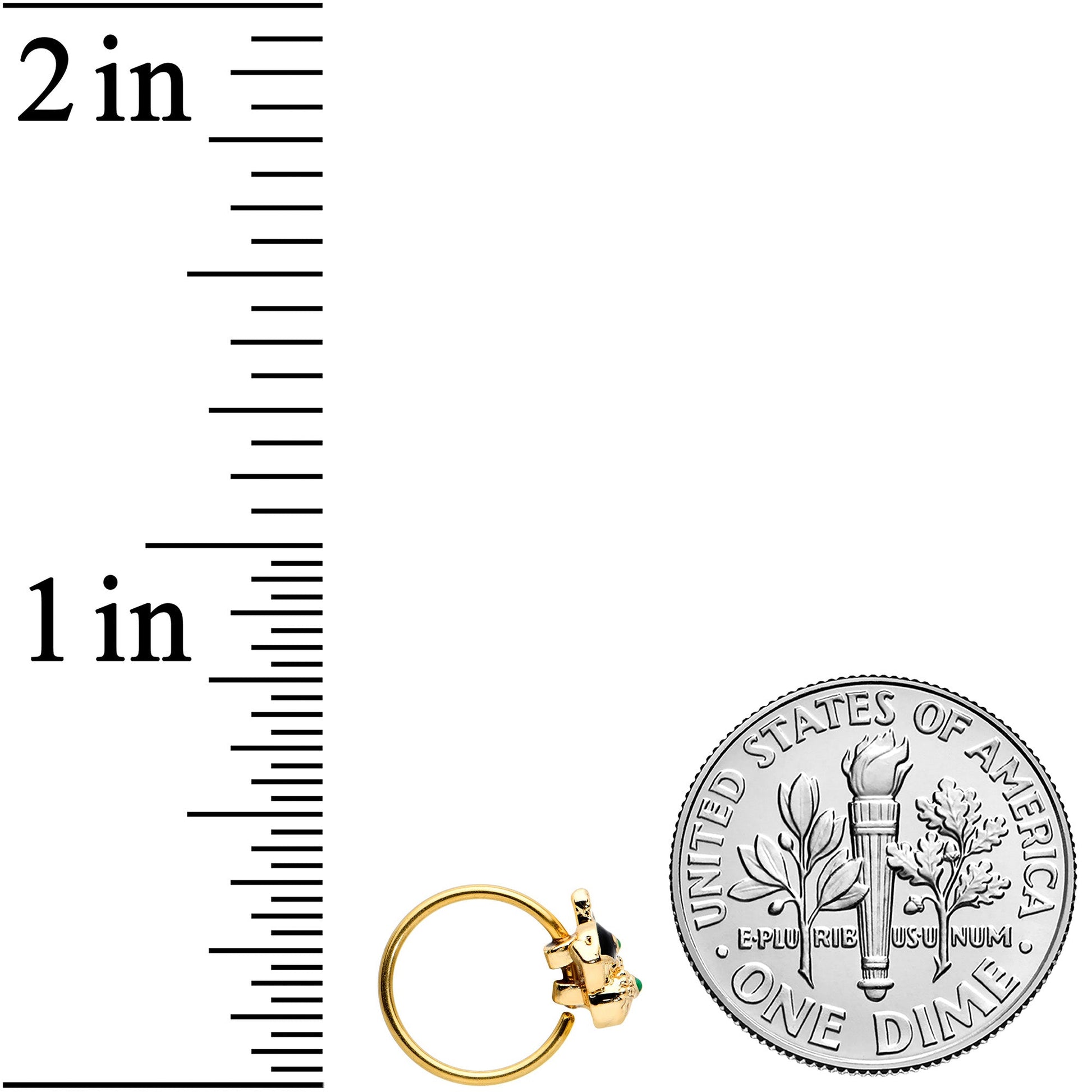 The whales on this 20 gauge nostril ring show that style runs in the family! It's made with an 8mm gold tone PVD over 316L surgical grade stainless steel circular ring. It features a whale charm, with a mother whale and baby. The mother has black embellishment and a green eye while the baby is set with textured detailing and also has a green eye embellishment. Show your love for these gorgeous creatures family-style with this wonderful whale-themed nose piercing ring!Specifications