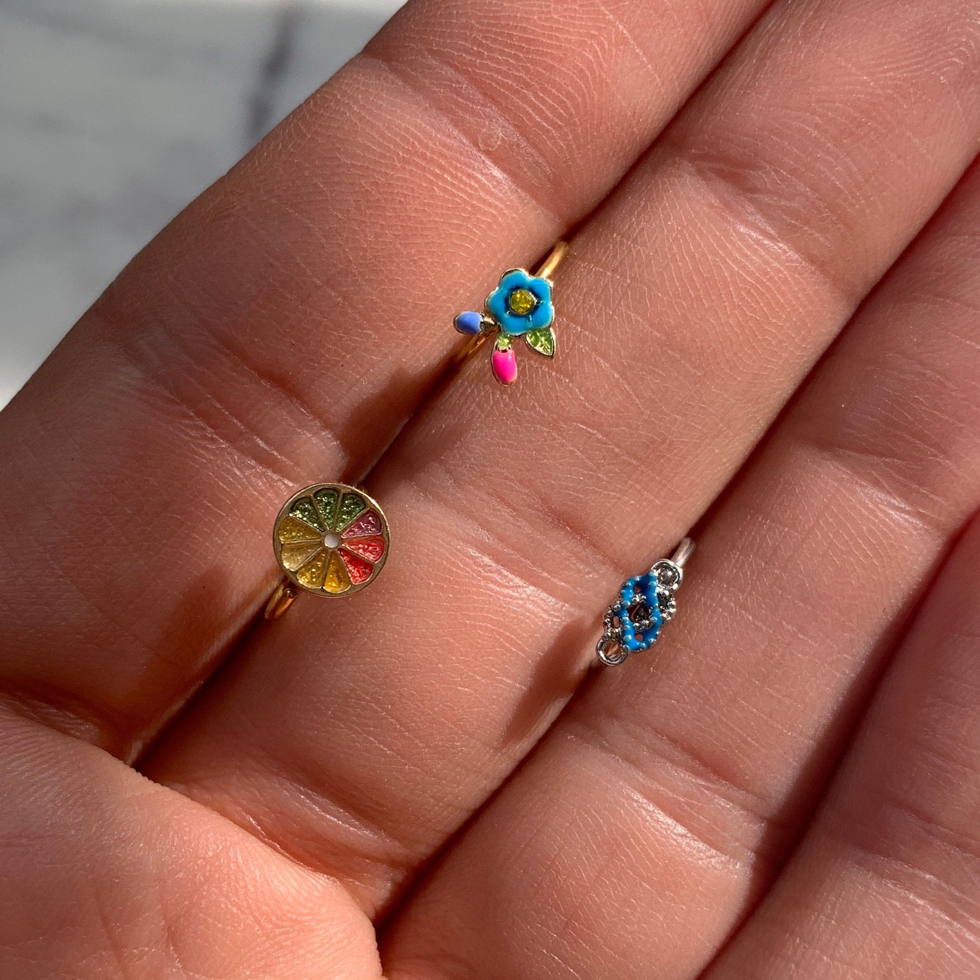 Brighten up your day with the bright colors of this 20 gauge nostril ring! It's made with an 8mm gold tone PVD over 316L surgical grade stainless steel seamless circular ring and features a flower charm with bright blue petals and a yellow gem set at its center. This nose jewelry is super easy to insert and remove - simply twist the ring open, insert, and then twist gently shut again. Grab your garden shears and pick a pair of neon posies with the concentrated colors of this floral nostril piercing jewelry!Specifications