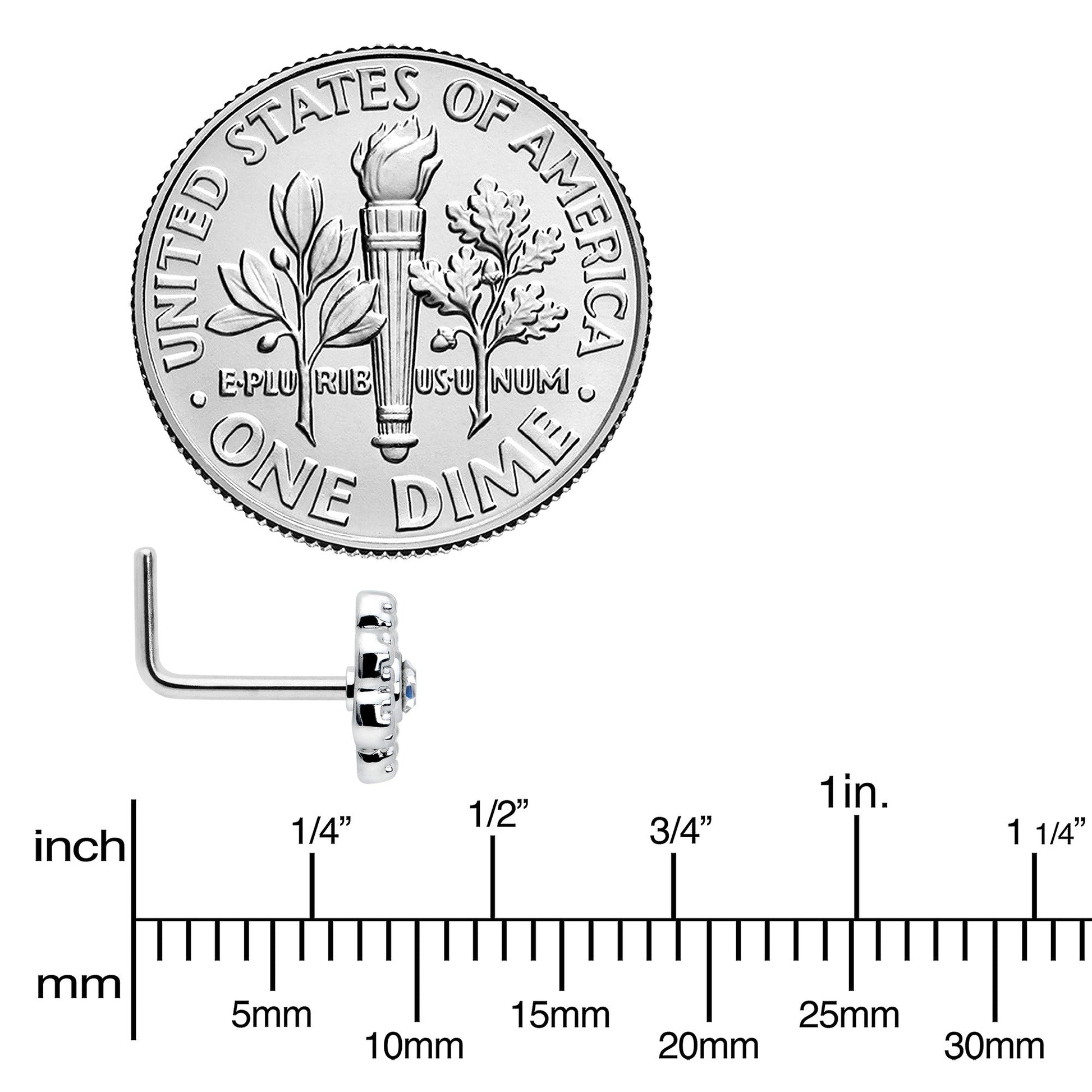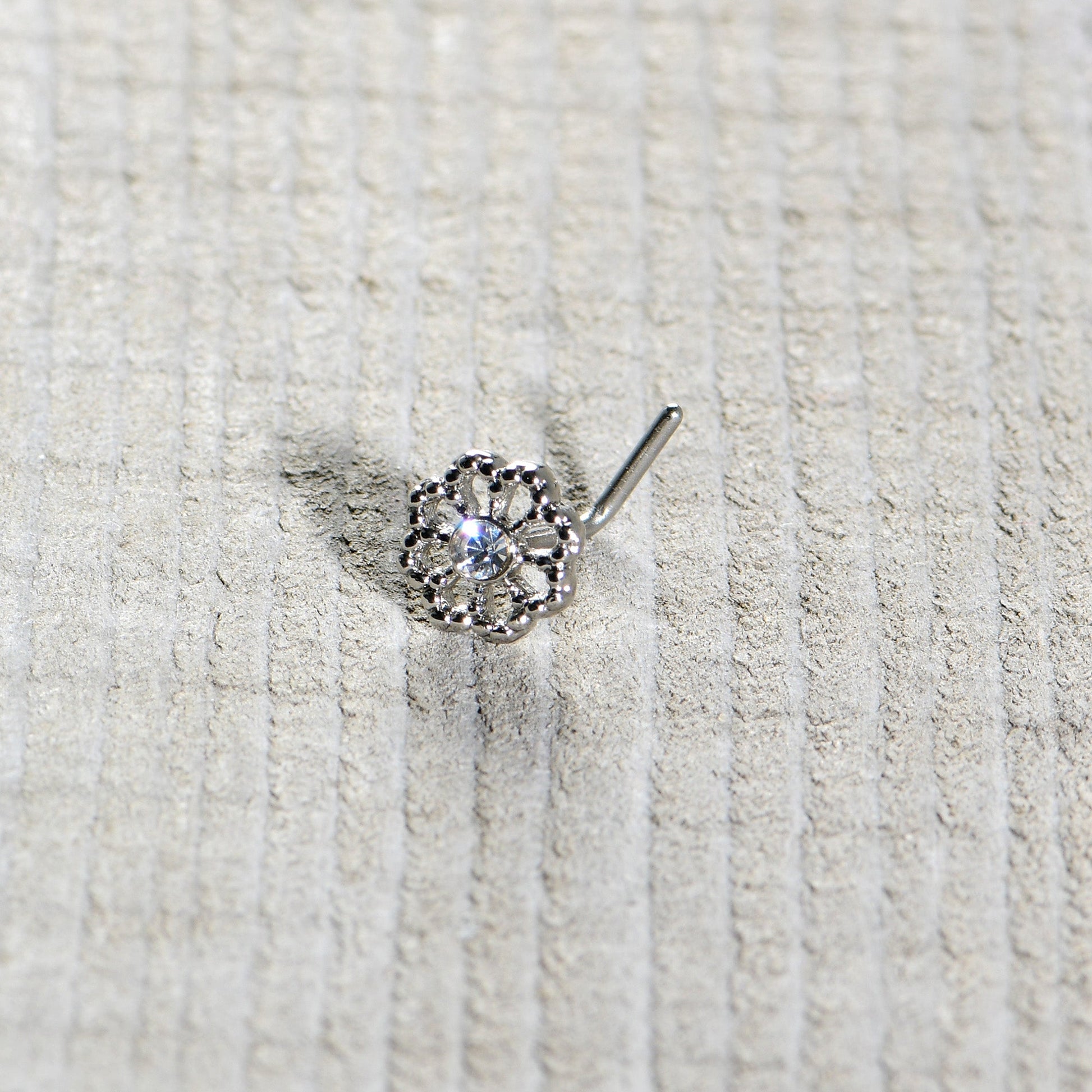For maximum style, go epic, like on this 20 gauge nostril ring! It's made with a .27" length at the bend 316L surgical grade stainless steel L-shaped post. It features a flower charm, heavily embellished with a clear gem center and textured detailing for maximum impact. If you're looking for flowers with style to spare, this nose piercing ring is sure to please!Specifications