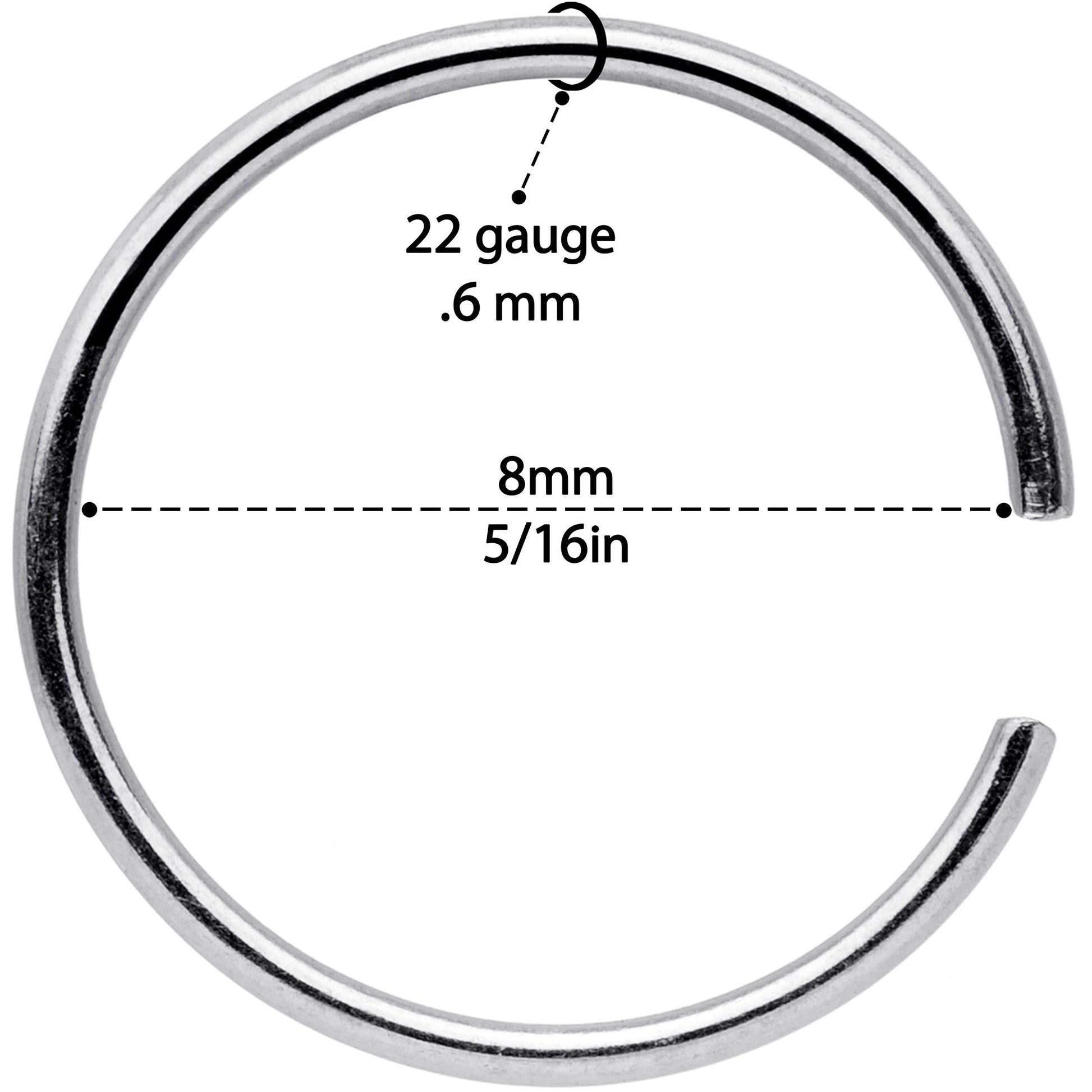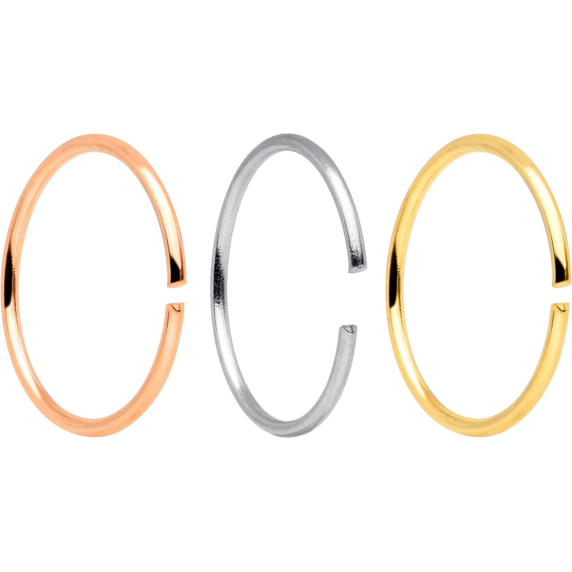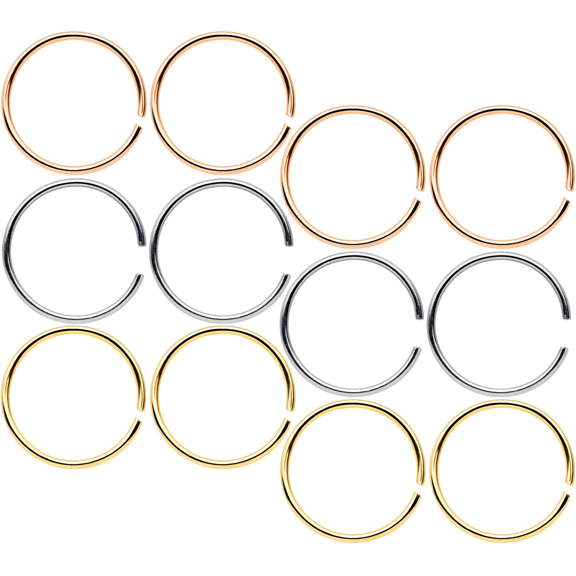Whether you have multiple nostril piercings and prefer a matching look or are simply prone to losing things, this set of 22 gauge nose rings has you covered. Four are made with 8mm rose gold tone anodized over 316L surgical grade stainless steel seamless circular rings, for a modern and stylish look. Four are made with 8mm gold tone anodized over 316L surgical grade stainless steel seamless circular rings, for a classically elegant look. And you also get four made with 8mm durable 316L surgical grade stainless steel seamless circular rings for a traditional appearance. This nostril jewelry is super easy to insert and remove - simply twist the ring open, insert, and then twist gently shut again. And with so many in the set, you can be sure of always having a beautiful nose ring to wear! Sold as a set of twelve. These are universal seamless rings for multiple body piercings including ear, lip and septum or nose.Specifications