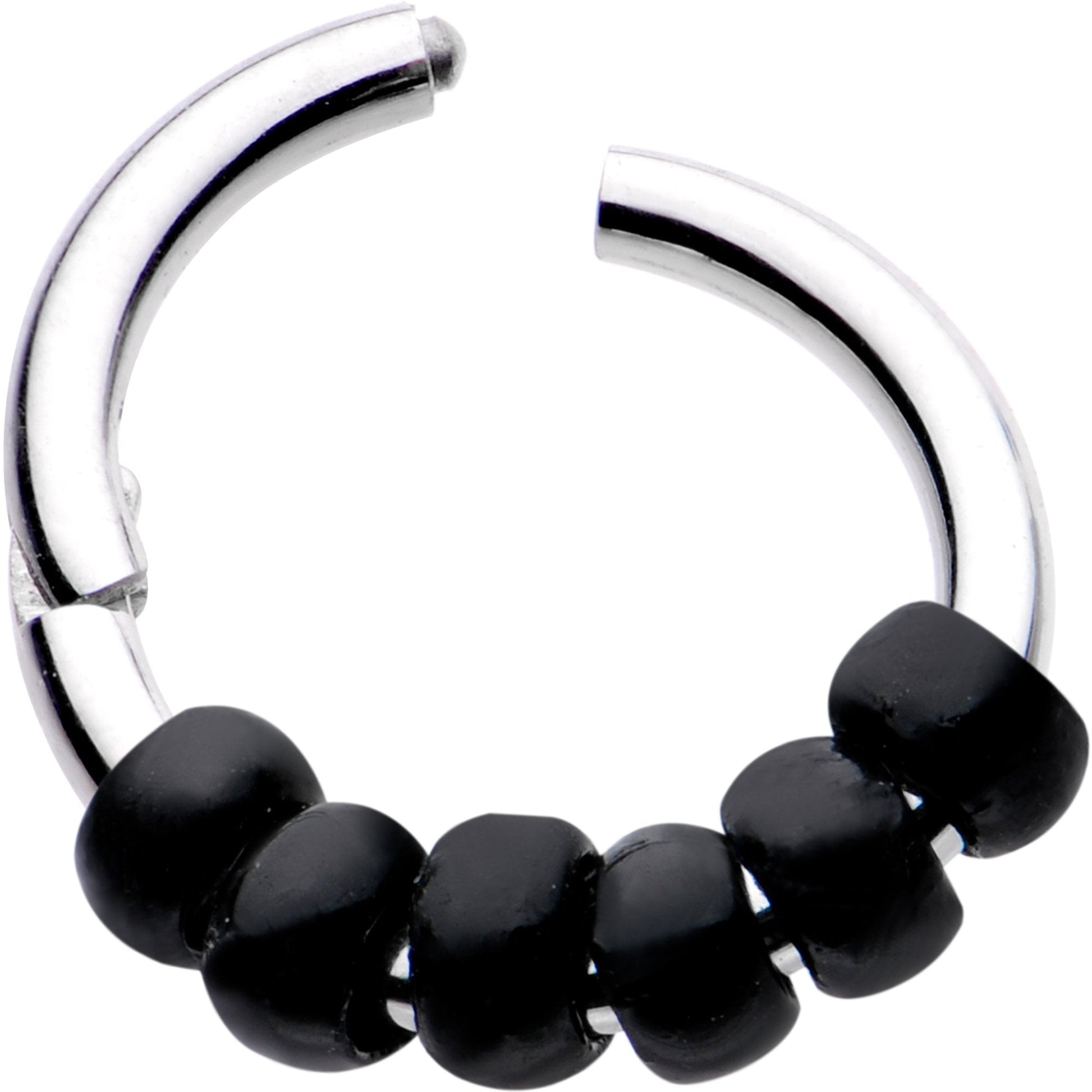This hinged segment ring is more than your average circular piercing. This 8mm captive ring features six black tone beads to create a singular look. Made from durable 316L surgical grade stainless steel, this 16 gauge segment ring features a hinged, non-removable segment for easy insertion and removal from your piercing. This item is sold individually so purchase two for a pair.