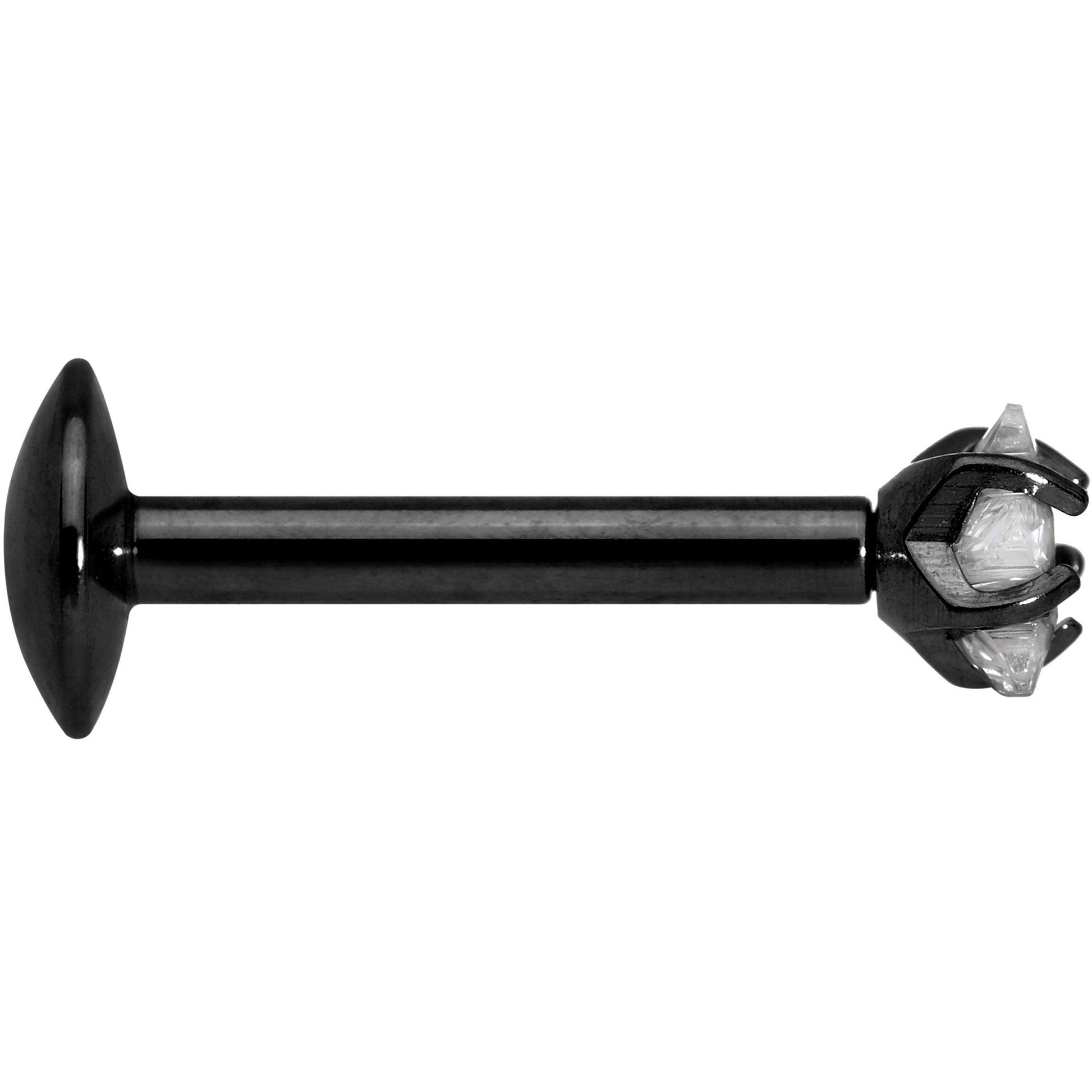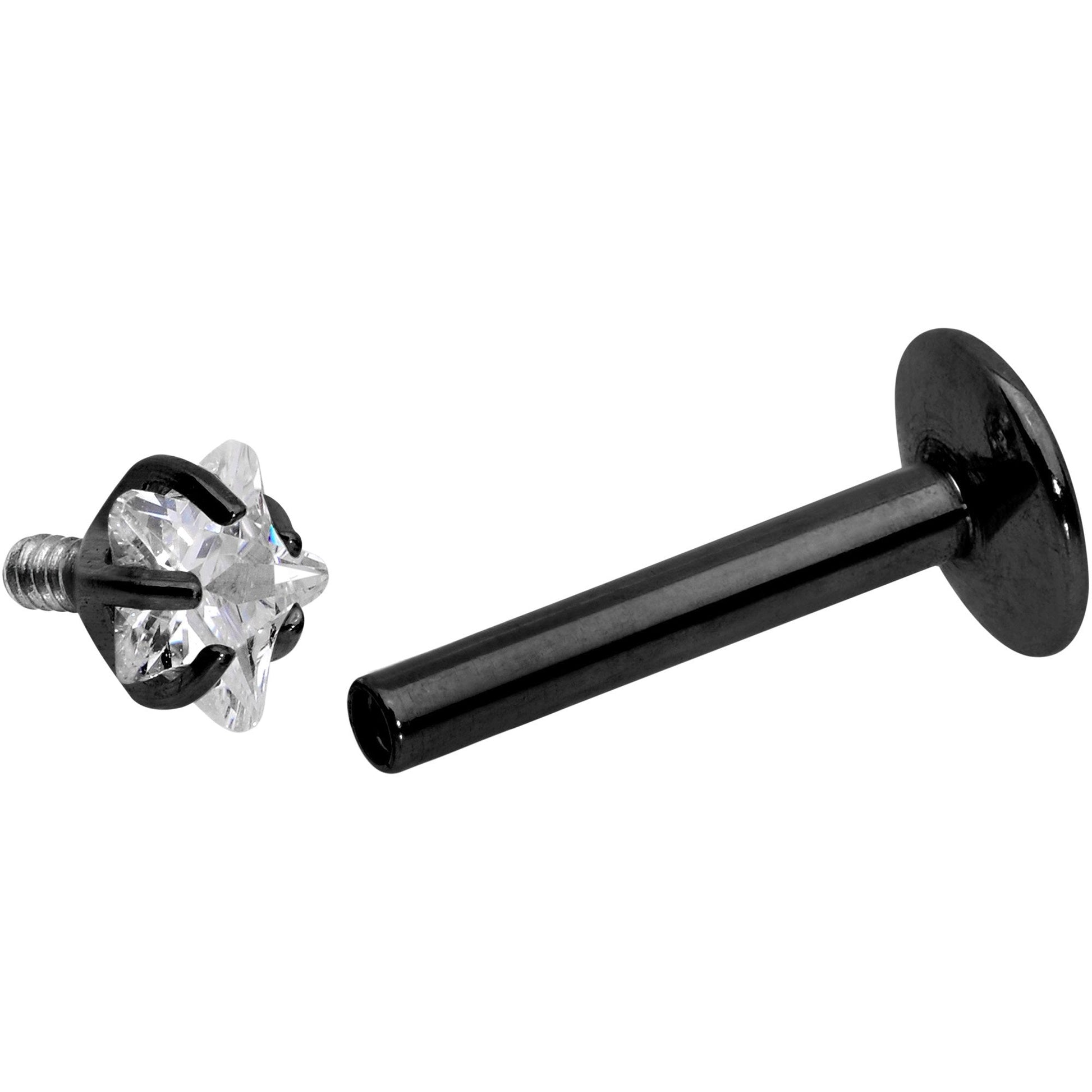 If you love simple yet stylish labret jewelry, then you will love this 16 gauge flat back barbell. Made with a 8mm black PVD over 316L surgical grade stainless steel straight post, this labret piercing features an internally threaded 2mm clear cubic zirconia, star-shaped gem end. Features a flat back that is perfect for a labret piercing, monroe piercing, or even a cartilage piercing.Specifications