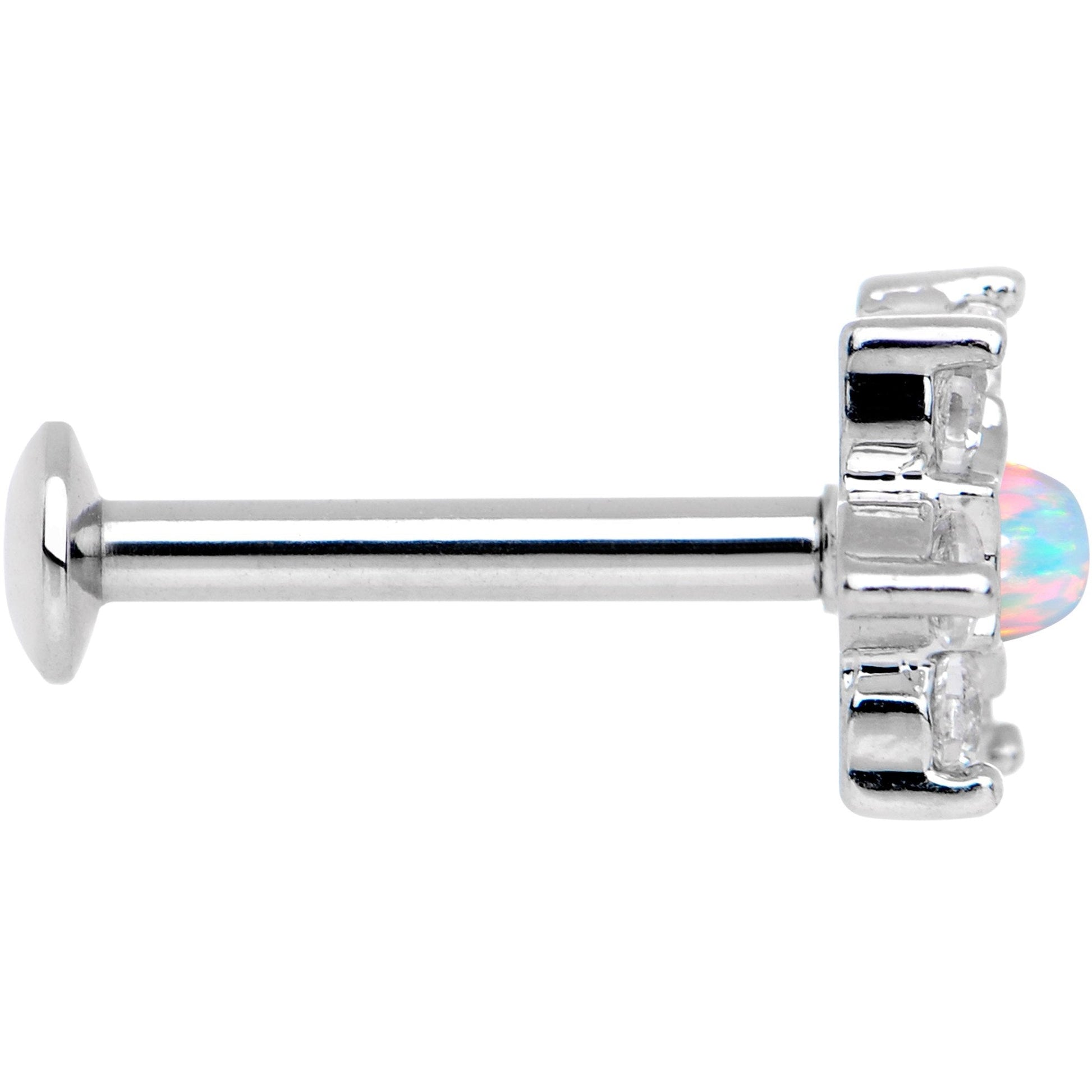 Exquisite design meets sophisticated taste on this striking labret monroe post. This 16 gauge labret piercing features a star flower design with clear cubic zirconia gem petals and a white faux opal at its center. The flower charm is mounted on an 8mm straight barbell made with durable 316L surgical grade stainless steel. This body jewelry features a flat backing that makes it a perfect fitin a variety of piercings including labret, monroe, tragus, and other cartilage piercings.