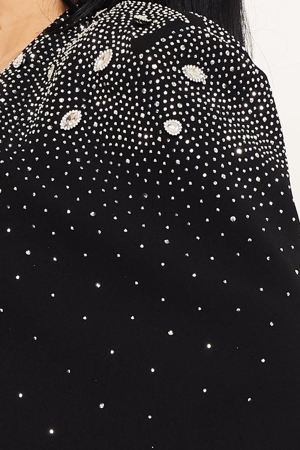 Perfect for pairing with evening gowns, cocktail dresses, or sleek jumpsuits, this rhinestone-embellished cape jacket transforms any outfit into a red-carpet look.