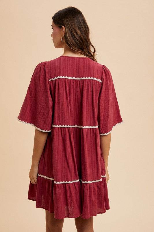 Annie Wear Tassel Contrast Trim Tie Neck Half Sleeve Tiered Dress