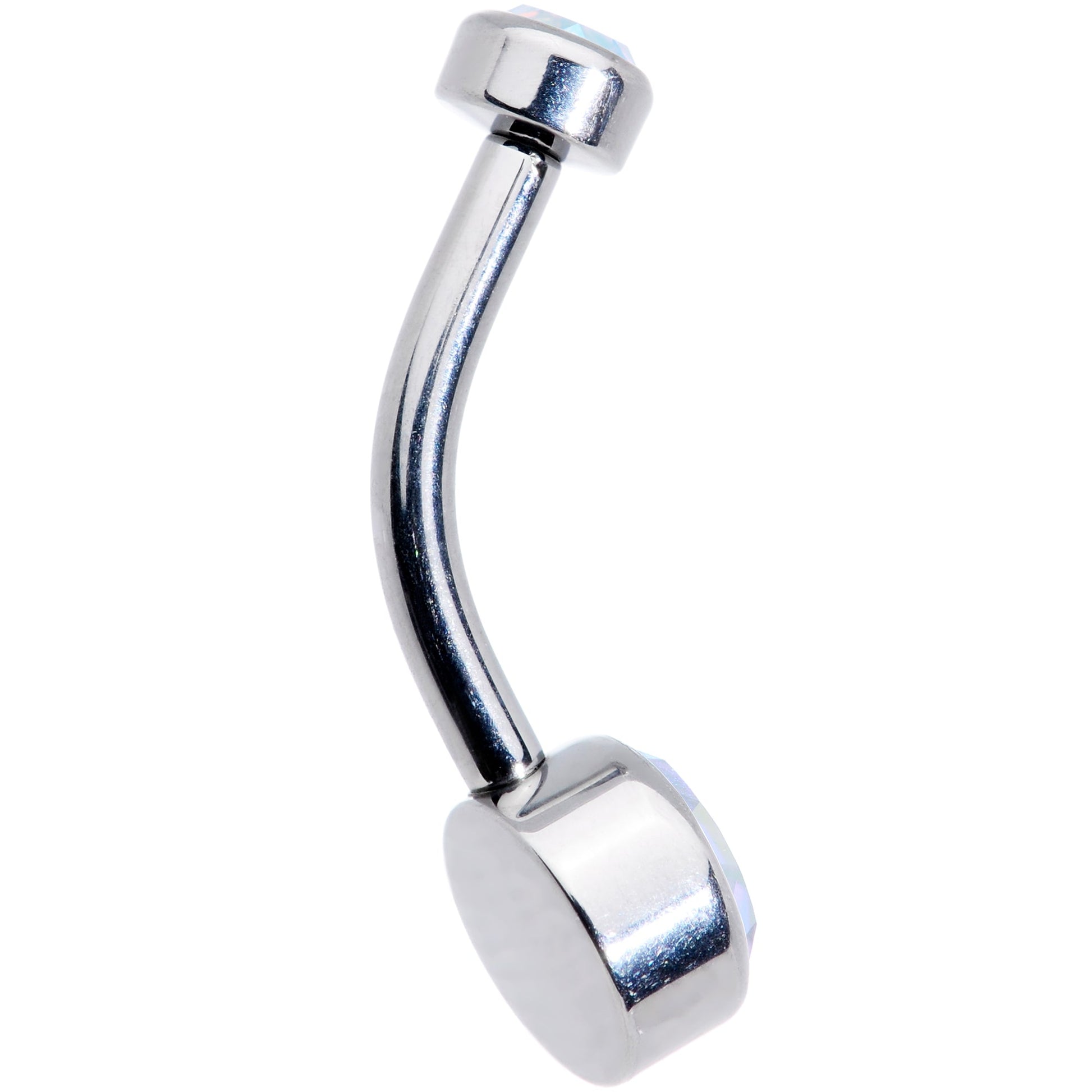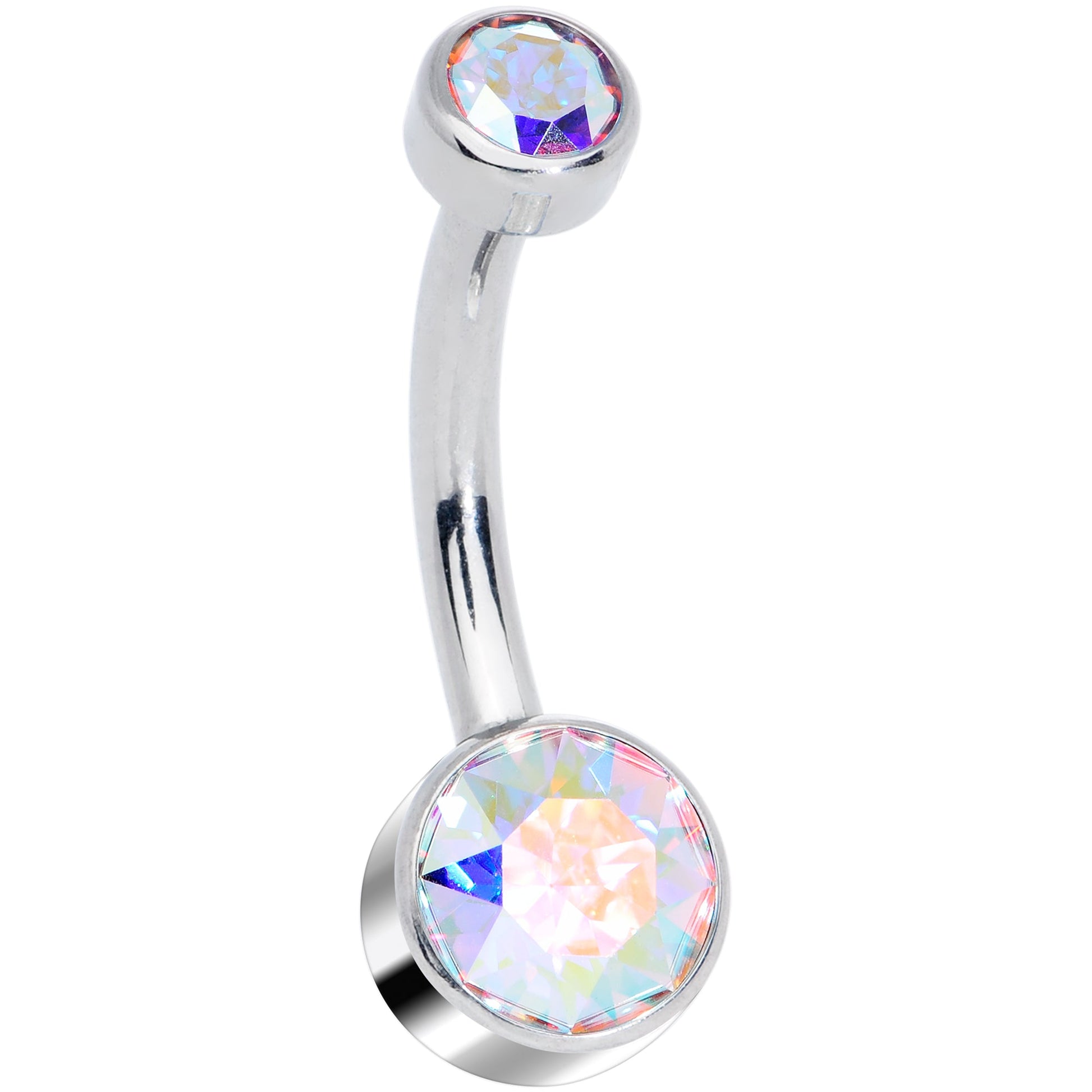 Keeping it simple doesn't mean keeping it boring or sacrificing quality with this 14 gauge navel ring! It's made with a 3/8" solid grade 23 implant grade titanium curved barbell. The 4mm top end and 6mm bottom end feature aurora crystals created with Crystals. It's also internally threaded for super comfortable insertion and removal. If you want to add some color and glamour to your belly piercing but keep an elegant appearance, this belly button jewelry has everything you need in one beautiful, comfortable package!Specifications