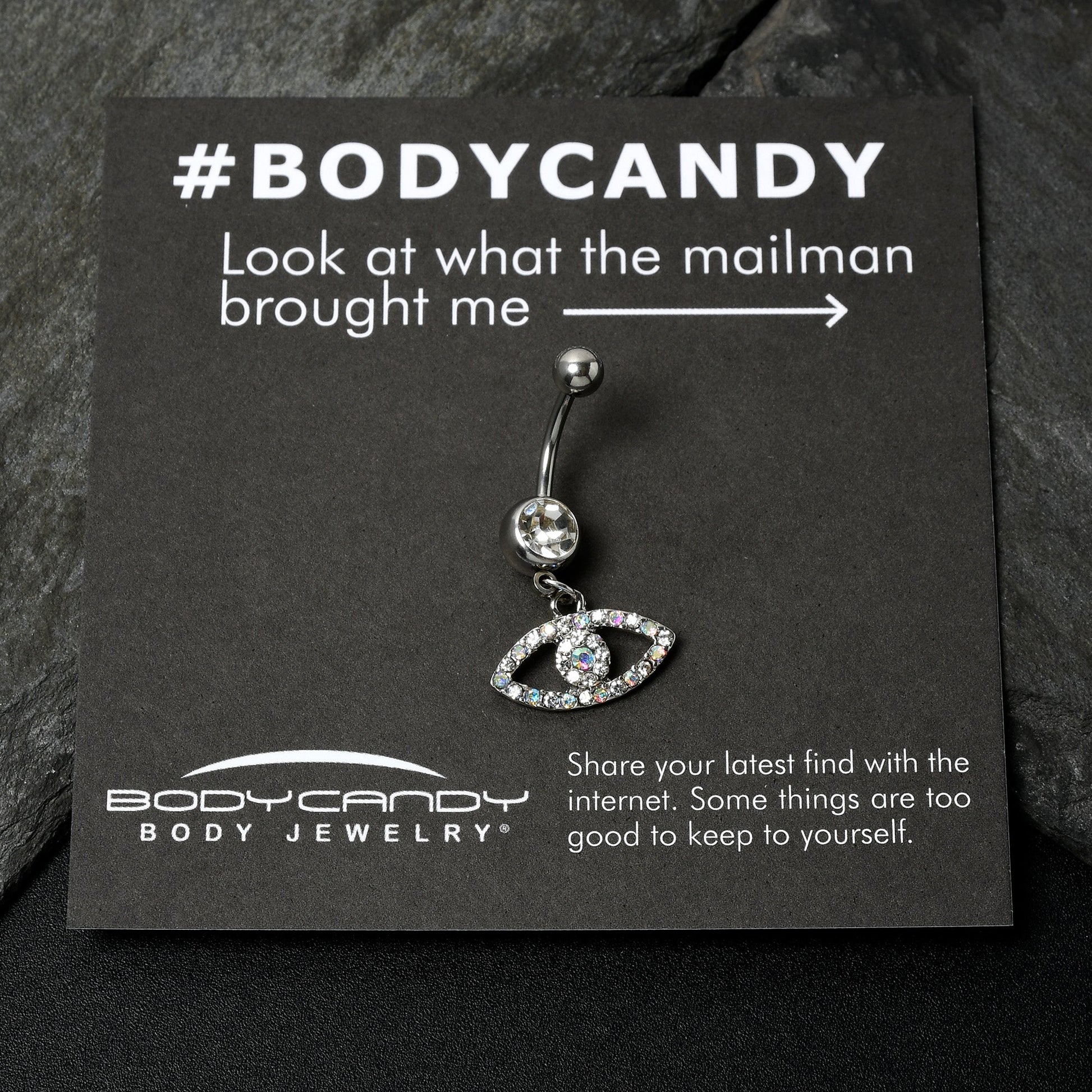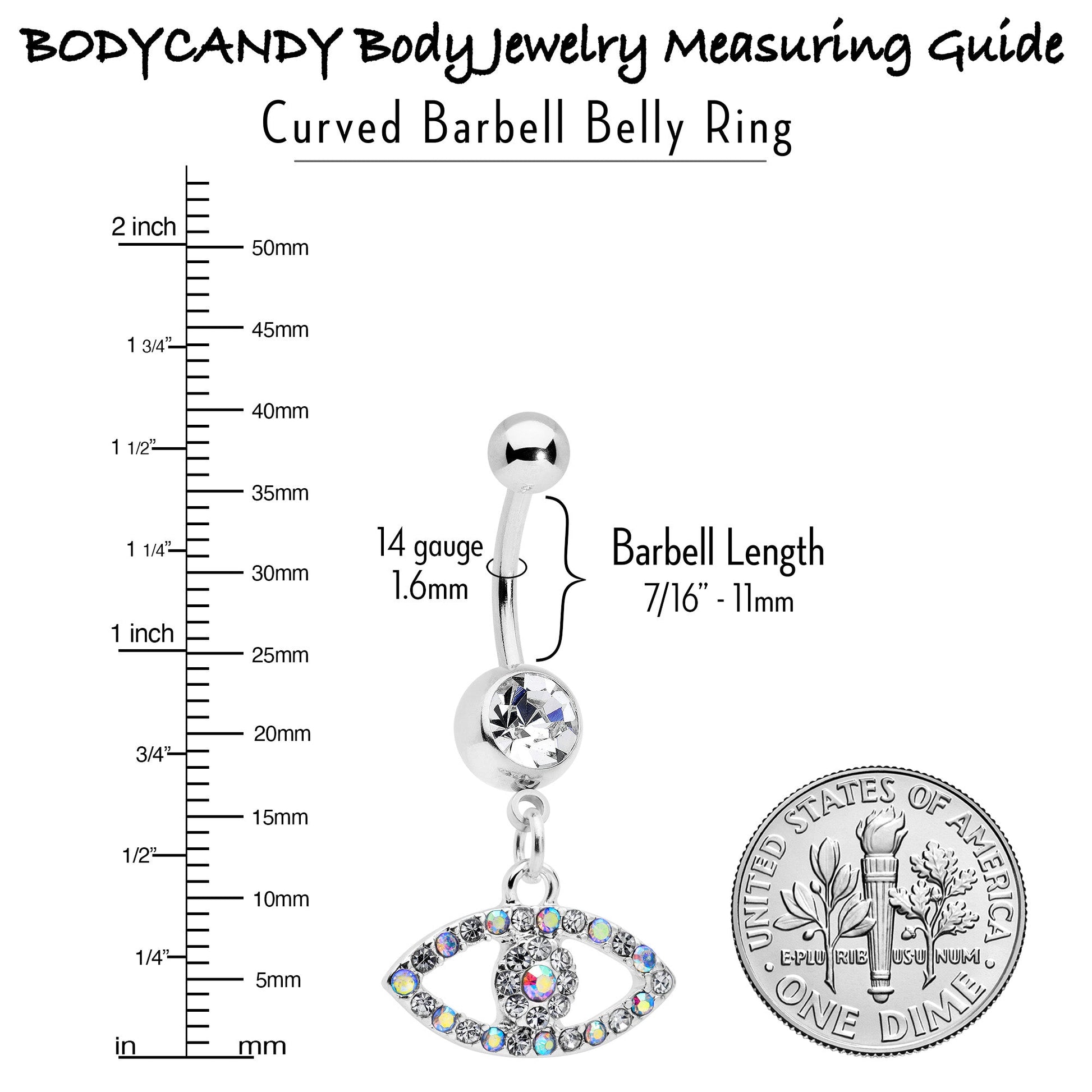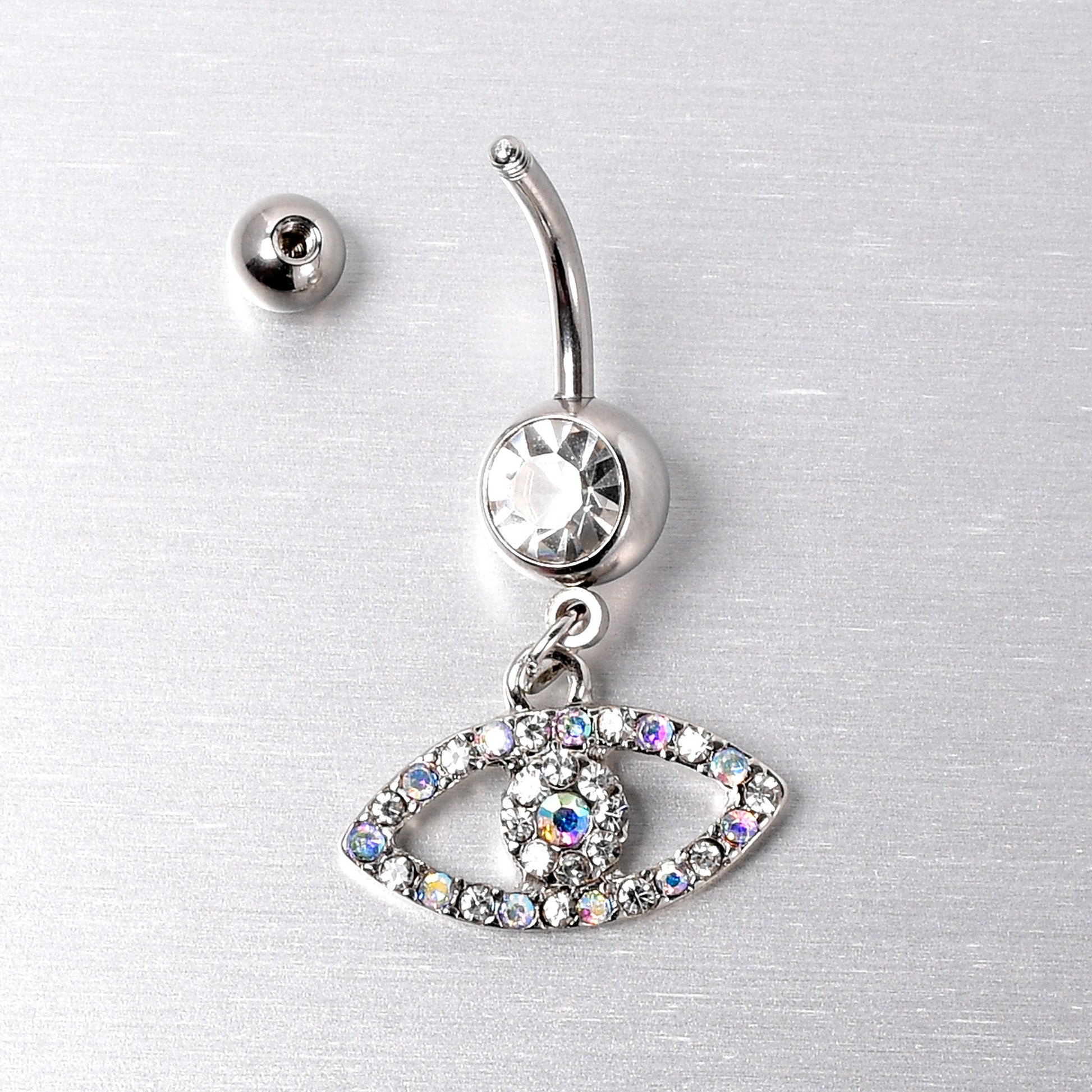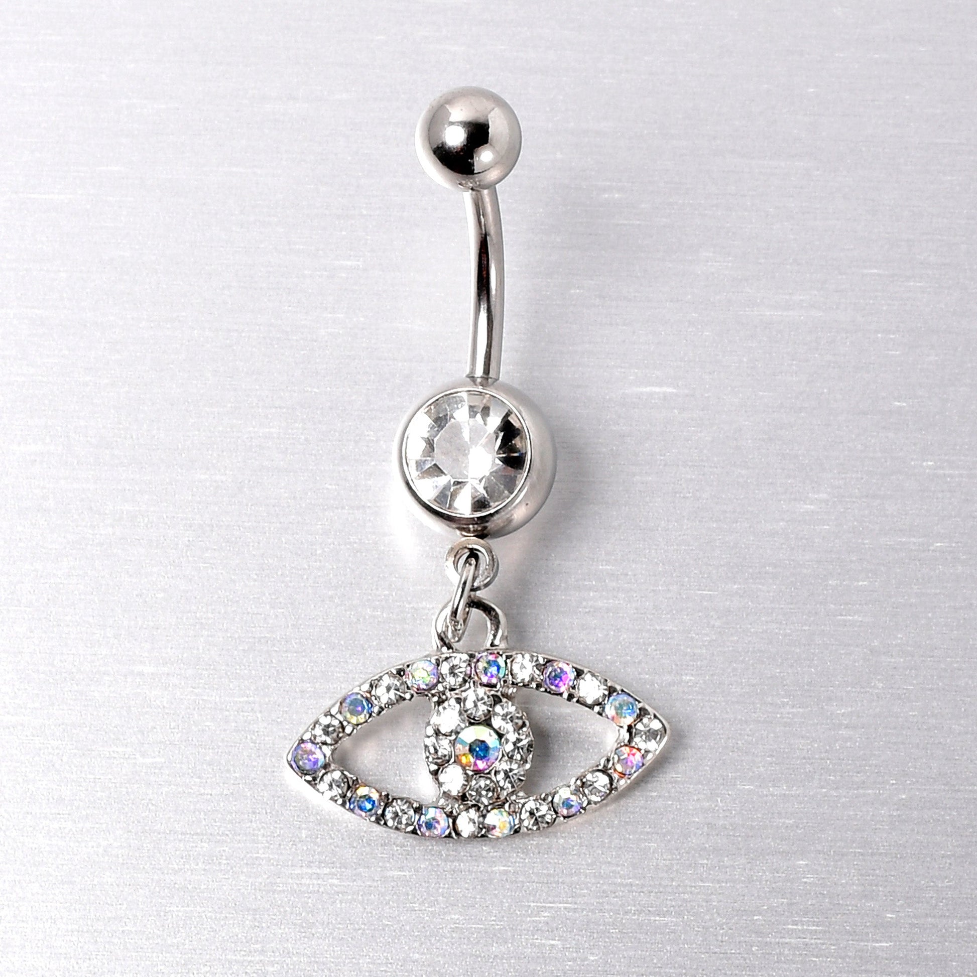 Keep your eyes open and you will spot amazing things - like this 14 gauge navel ring. It is made with a 3/8 inch durable 316L surgical grade stainless steel curved barbell with a 5mm top ball end. The bottom ball end is 8mm and set with a clear gem.Dangling beneath is an eye charm, with the rim paved in aurora and clear gems. The center of the eye features more clear and aurora gems for a cohesive look. You will have all eyes on you with this eye-opening belly piercing ring.Specifications