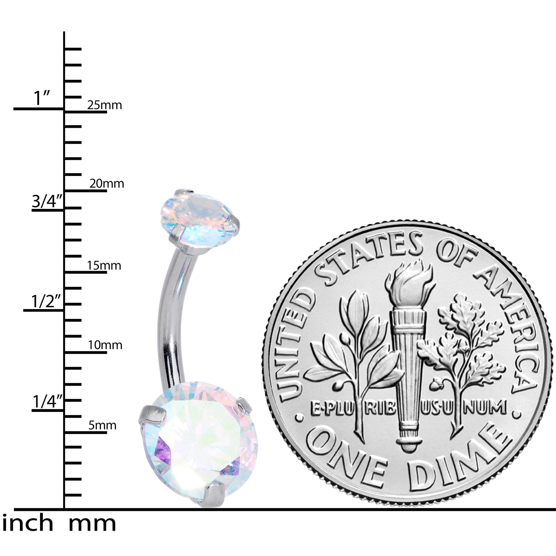 Double the color, double the glamour with this 14 gauge navel ring! It's made with a 3/8" durable 316L surgical grade stainless steel curved barbell. The top end is a 5mm aurora cubic zirconia gem. The bottom end is a matching 8mm aurora cubic zirconia gem and it's internally threaded for comfortable insertion and removal. The overall look is one of uncomplicated elegance that's both traditional and trendy. If you want it all in one neat package, you want this classy, colorful belly button jewelry!Specifications