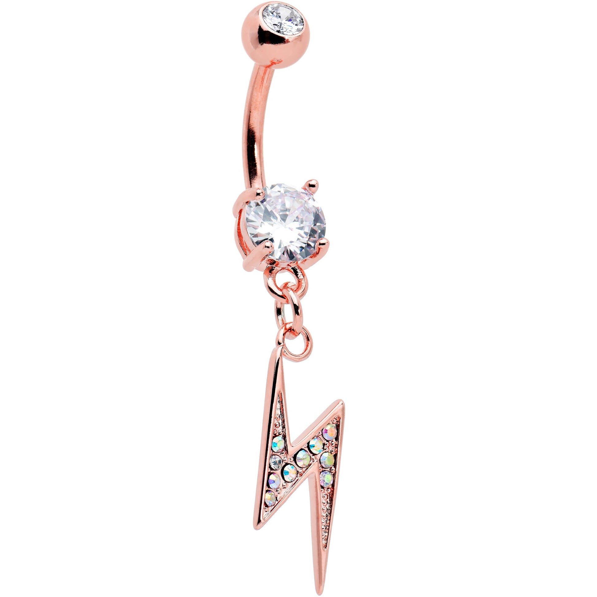 Let lightning strike your look with glam style when you're rocking this 14 gauge navel ring! It's made with a 3/8" rose gold tone PVD over 316L surgical curved barbell with a 5mm top ball end, which is set with a clear gem. The bottom end features a single large clear gem for a cohesive appearance. Dangling from the bottom is a lightning bolt charm, set with aurora cubic zirconia gems for an added strike of color. Your look will light up the skies with this super stylish lightning bolt belly piercing jewelry!Specifications