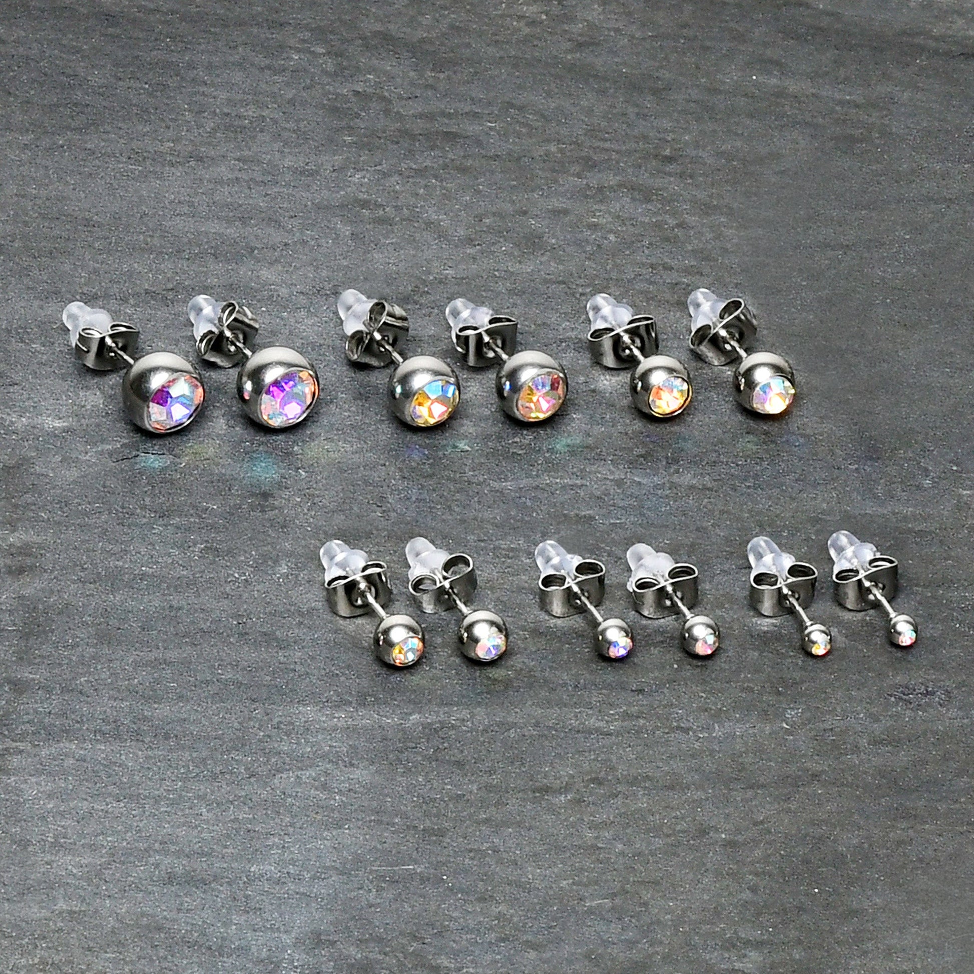If you are looking for classic style that goes with everything, these 20 gauge earrings will have you ready for any occasion. They are made with 316L surgical grade stainless steel straight posts and have butterfly style friction backs for a secure fit. They feature simple ball ends that are set with aurora gems. You get one pair each in 3mm, 4mm, 5mm, 6mm, 7mm, and 8mm for a touch of classic chic to go with every look. These are sure to add some simple elegance to your pierced lobes. Sold as a set of six.Specifications