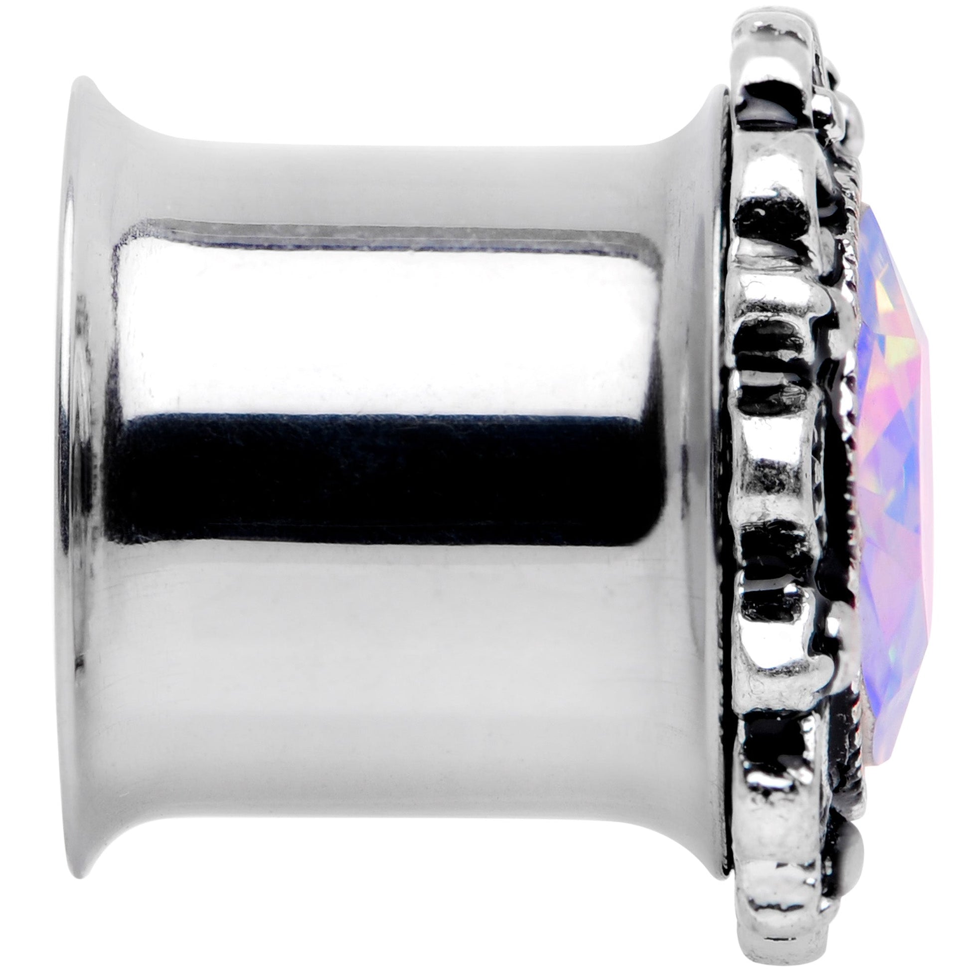 Like a flower blooming in the morning, these ear gauges are all ready to show off their beautiful centers every time they catch the sun! They're made with 316L surgical grade stainless steel and features a double flare design for secure wear. They are set at the centers with large aurora gems and embellished along the edges with a filigree design, reminiscent of a flower's petals. Your earlobes will be sure to blossom with this striking set of plug jewelry! Sold as a set of two.