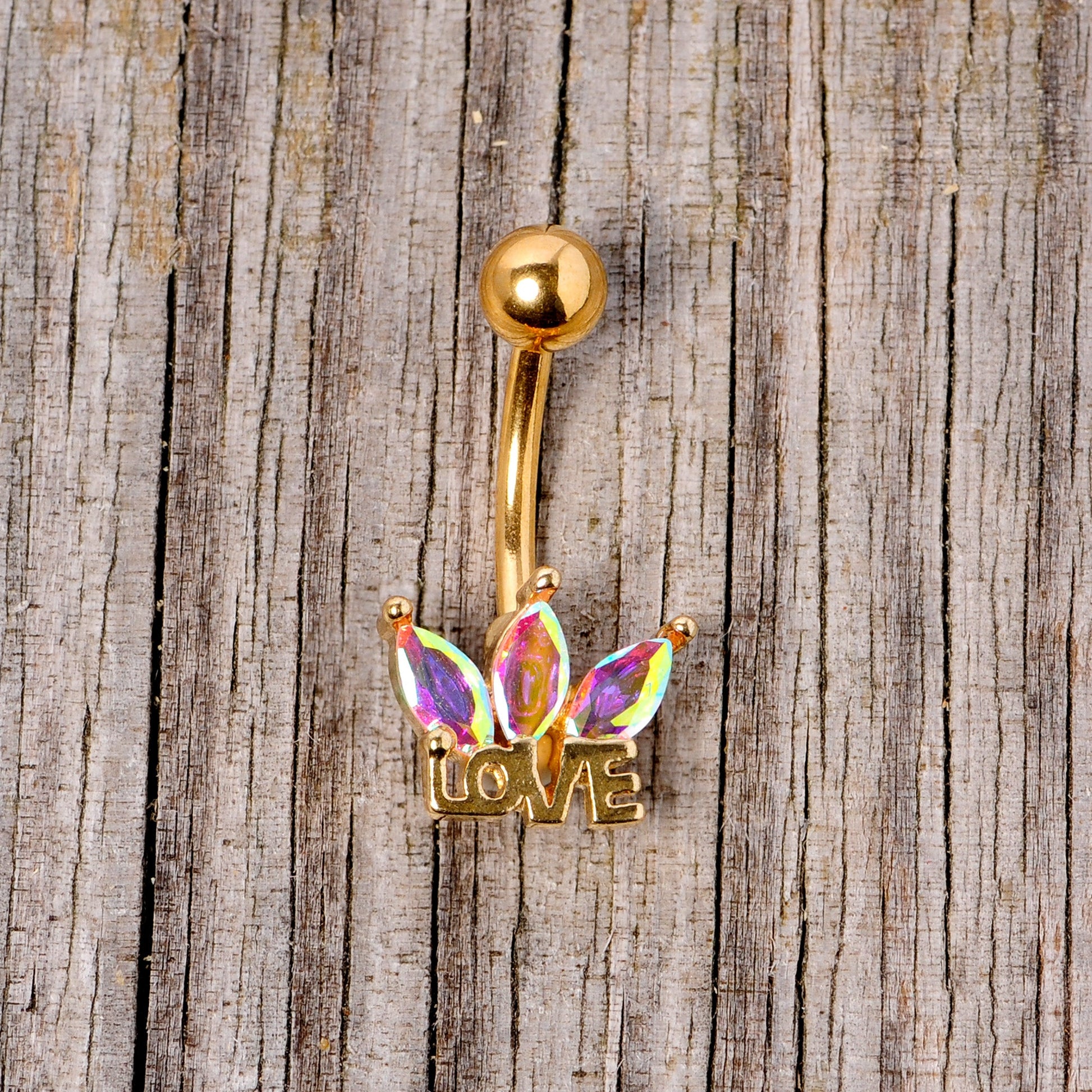 Show the world that love is king...or queen...with this 14 gauge navel jewelry! It's made with a 3/8" gold tone plated over 316L surgical grade stainless steel curved barbell with a 5mm top ball end. The bottom end features a trio of aurora color gems fanned out over the word "love" like a royal crown. Spread love whether it's Valentine's Day or not when you wear love with this elegant and timely belly button ring.Specifications