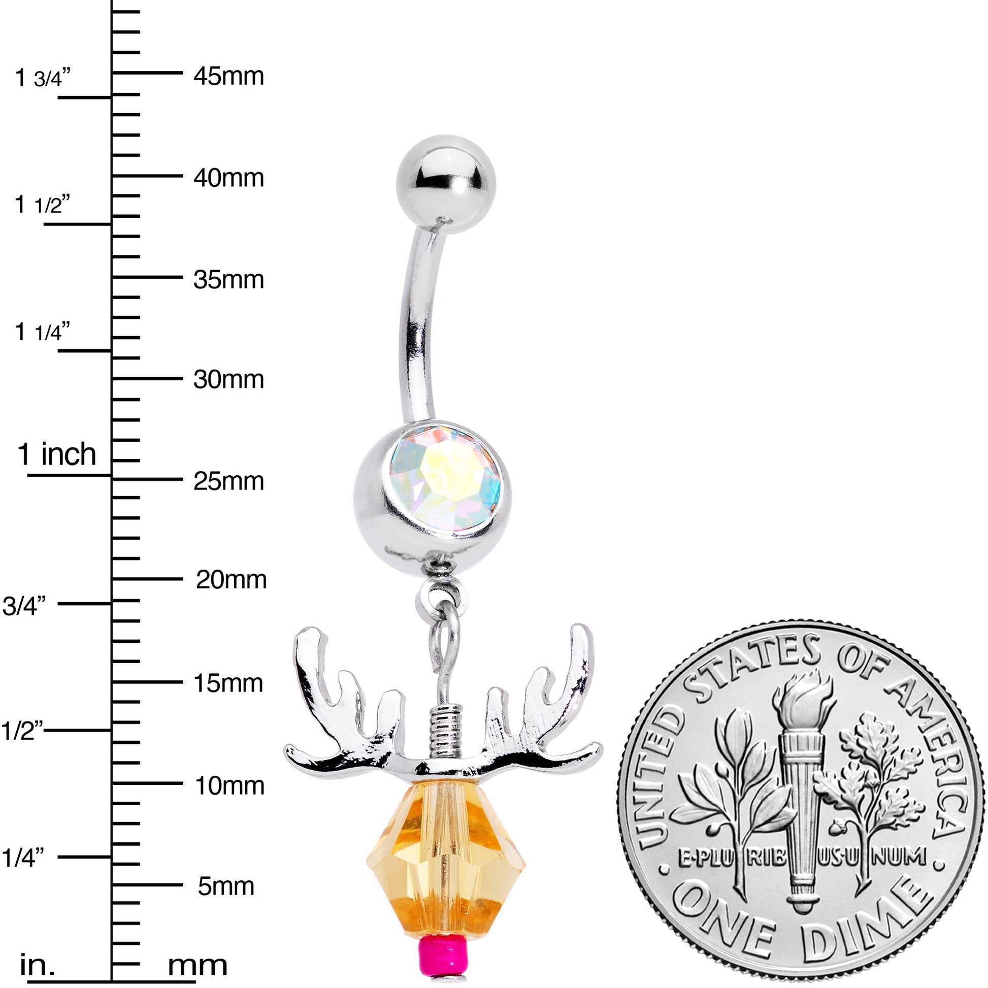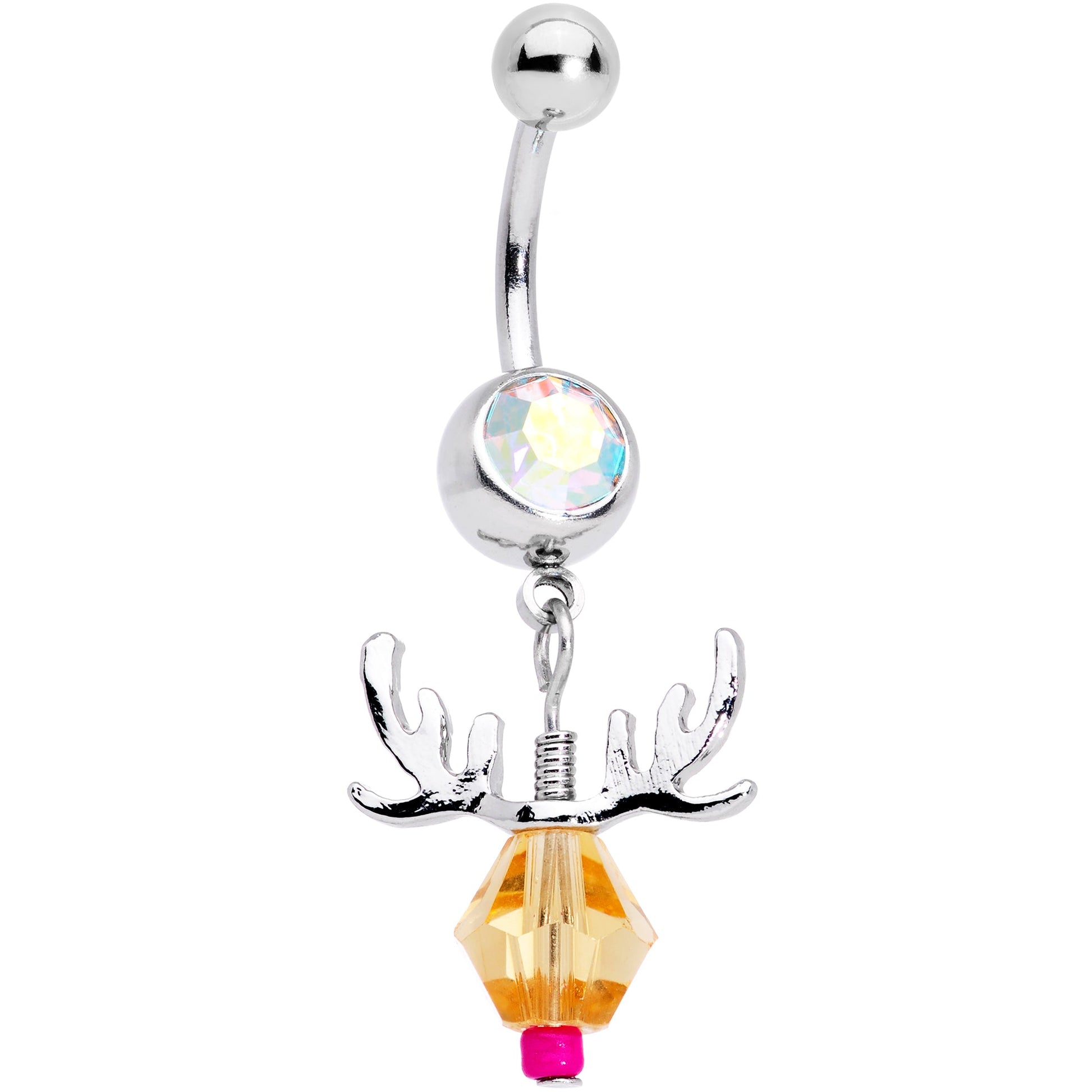 Rock a red nosed reindeer in your navel piercing with this 14 gauge belly button ring! It's made with a 3/8" durable 316L surgical grade stainless steel curved barbell with a 5mm top ball end. The bottom ball end is 8mm and set with a large aurora color gem. Dangling beneath the bottom ball end is a reindeer's head. The reindeer is composed of a faceted tan gem, with a red gem nose. It's embellished with antlers for a true feeling of the holiday spirit! Let this reindeer bring a sleigh full of festive holiday cheer to your ear with this winter themed navel ring!Specifications