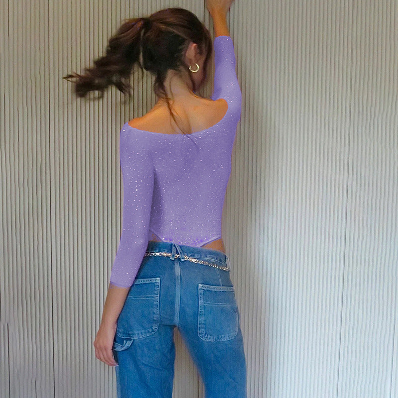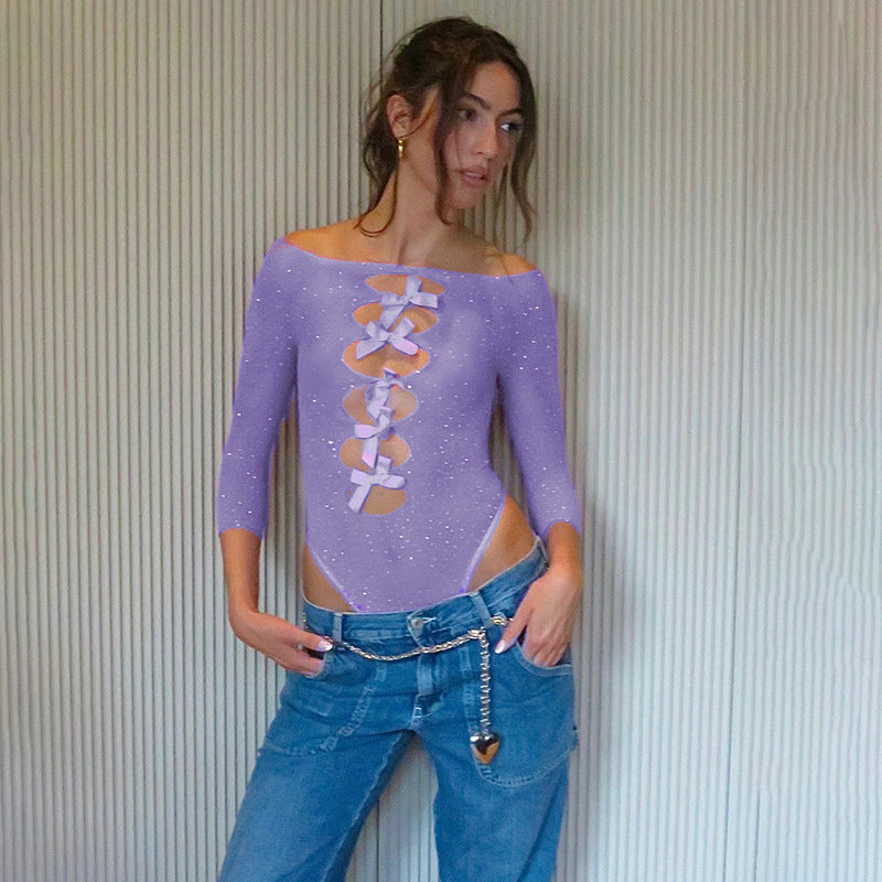 Autumn Sexy High Elastic Knitted See through Bow Hollow Out Cutout Rhinestone Jumpsuit