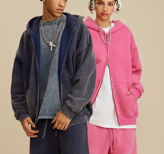 Autumn Winter Brand Washed Sweatshirt Hooded Cardigan Vintage Fleece-Lined Red Sweatshirt
