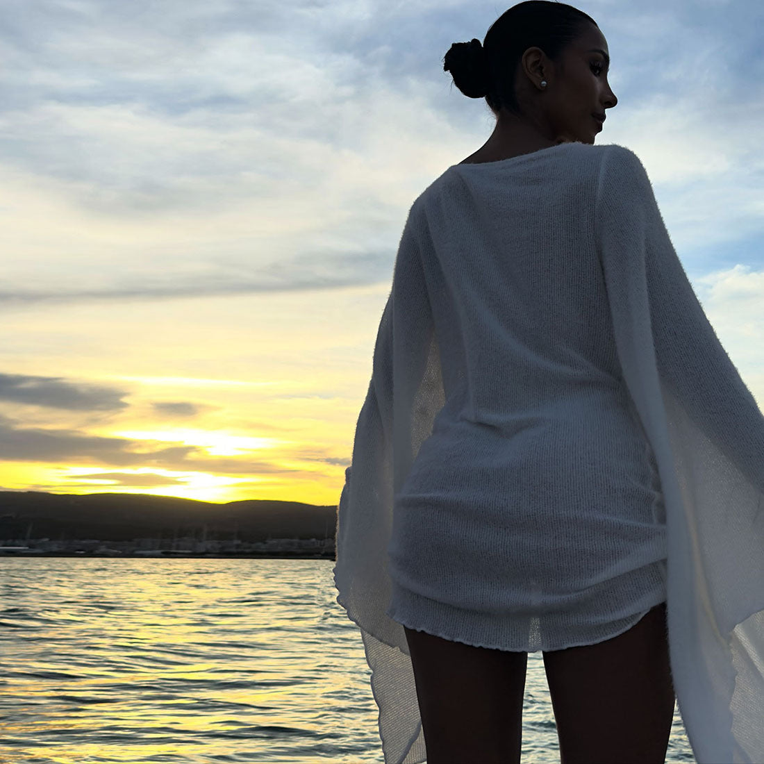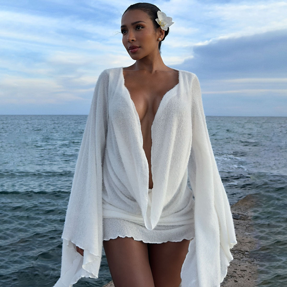 Autumn Winter Sexy Swing Collar Bell Sleeve Solid Color Sheath Short