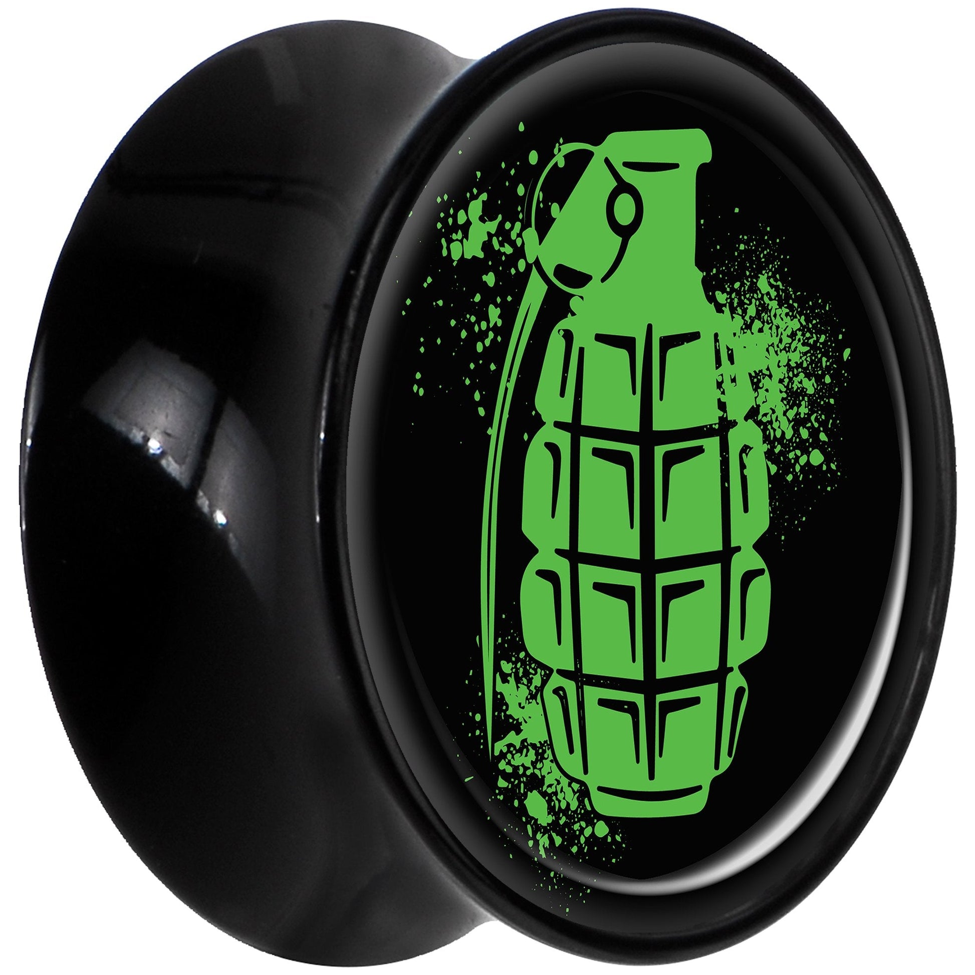 Hypoallergenic jewelry for sensitive skin.Black Acrylic Green Grenade Saddle Plug Set 9/16"