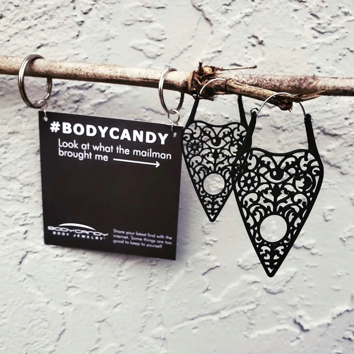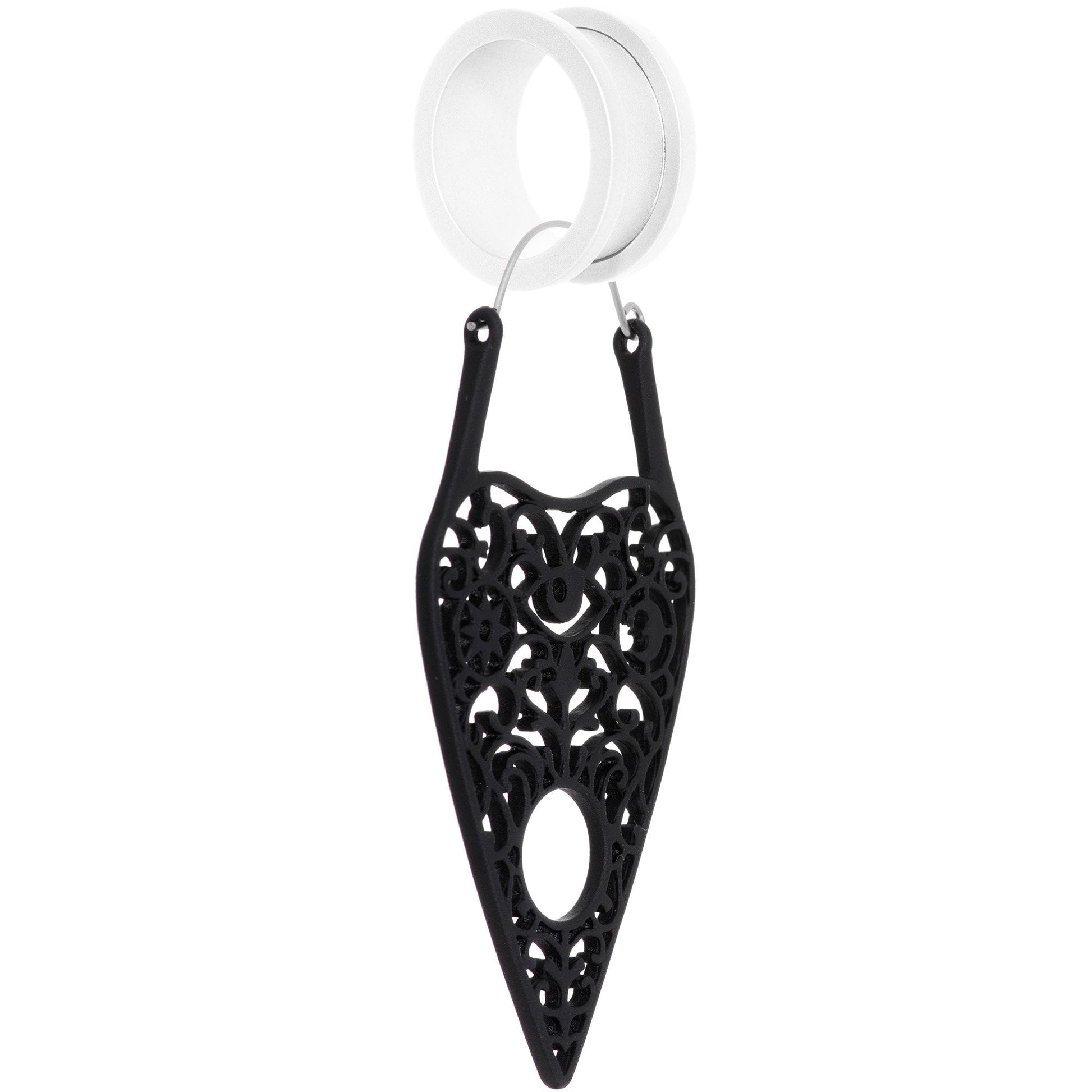 Get into the spooky spirit of Halloween all year round with these planchette tunnel plug earrings. Normally found atop a infamous game board, now they can hang from your ears where everyone can admire their intricate lacy detail. They have a 20 gauge pin made of durable 316L surgical grade stainless steel. They're 3" in length so you'll truly turn some heads with these on. Will they bring you messages from the other side? It's possible but they'll definitely bring you lots of attention! Designed to hang from tunnel plugs, they will also fit conventionally pierced lobes. Sold as a set of two.