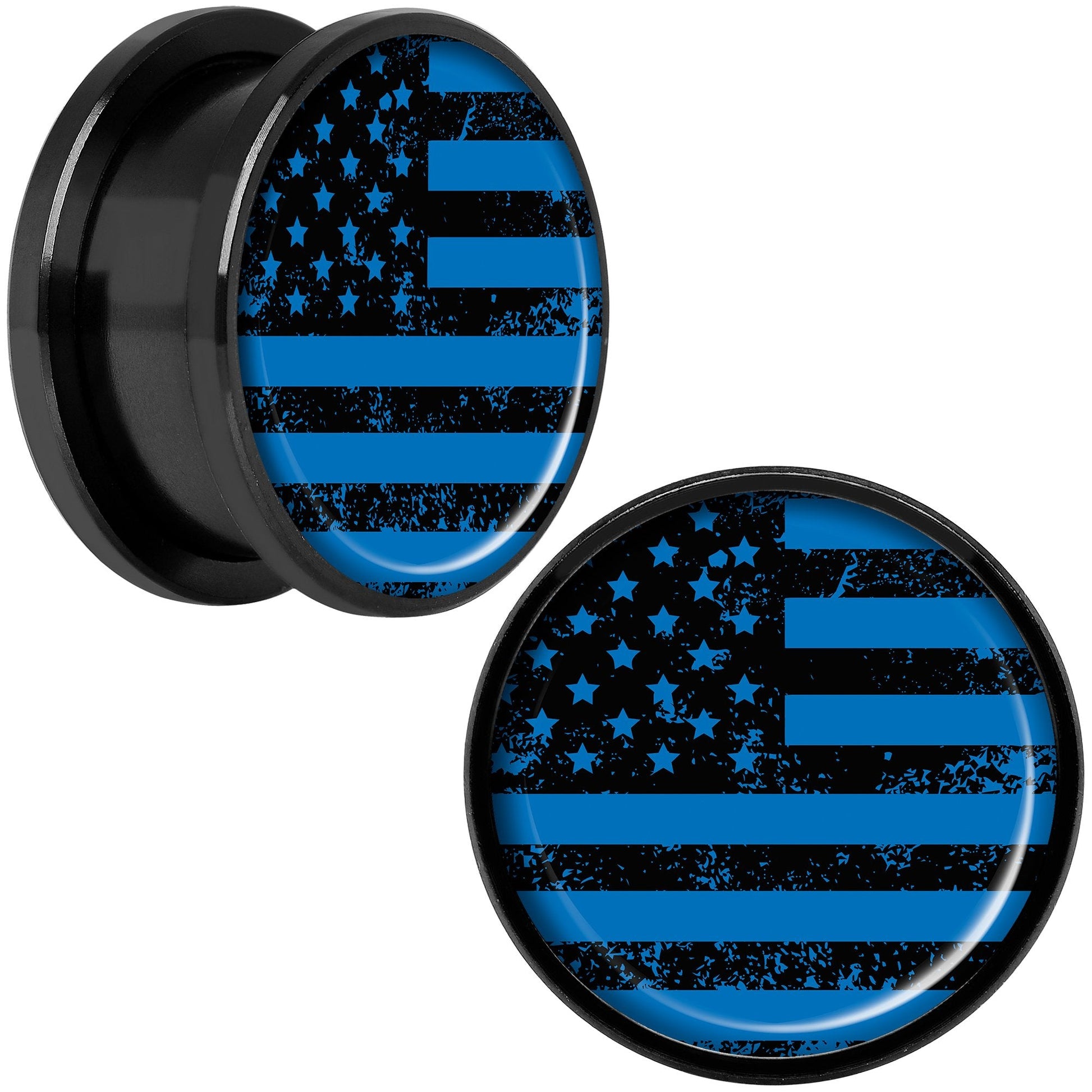 If you love the color blue and American flags then this pair of double flare plugs is right for you! Made with black anodized over 316L surgical grade stainless steel, these 11/16" ear gauges are made with a screw fit design for easier insertion and removal and are sold as a set of two for you.