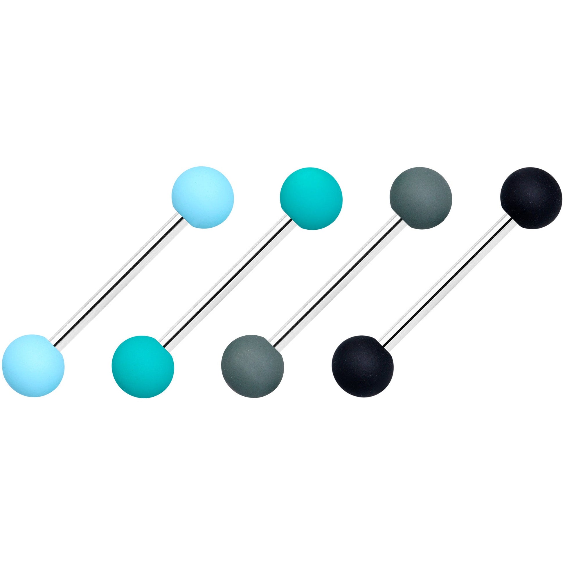 Add a touch of color to your tongue piercing with this set of stylishly colorful 14 gauge tongue jewelry! They're made with 5/8" durable 316L surgical grade stainless steel straight barbells. The 5mm ball ends are matte and feature a slightly soft finish. You get one each in light blue, teal, grey, and black. That's almost an entire wardrobe of tongue rings in one set to go with everything! Sold as a set of four.Specifications