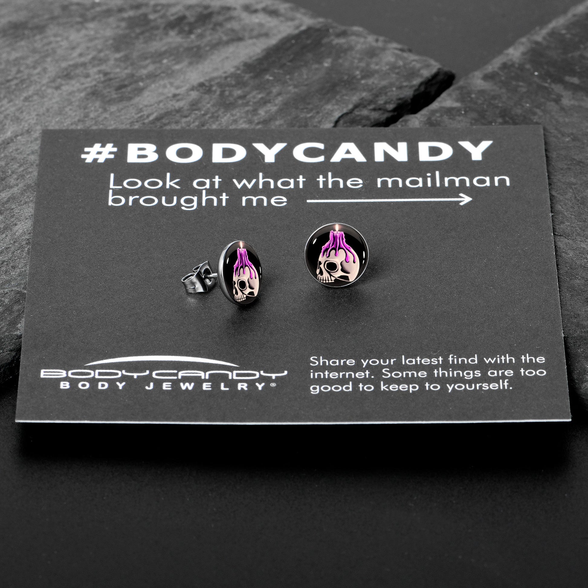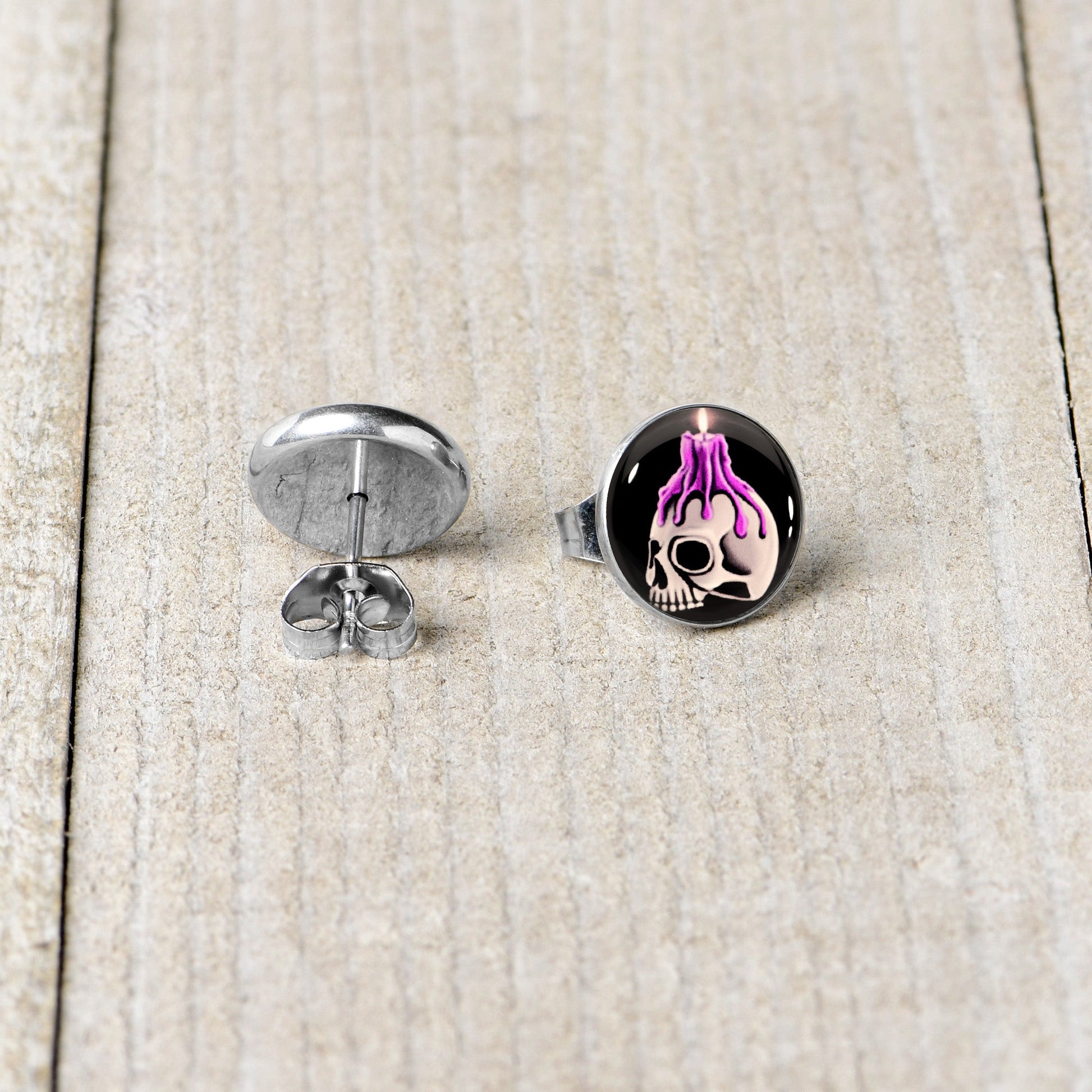Hypoallergenic jewelry for sensitive skin.Burning Skull Candle Stud Earrings