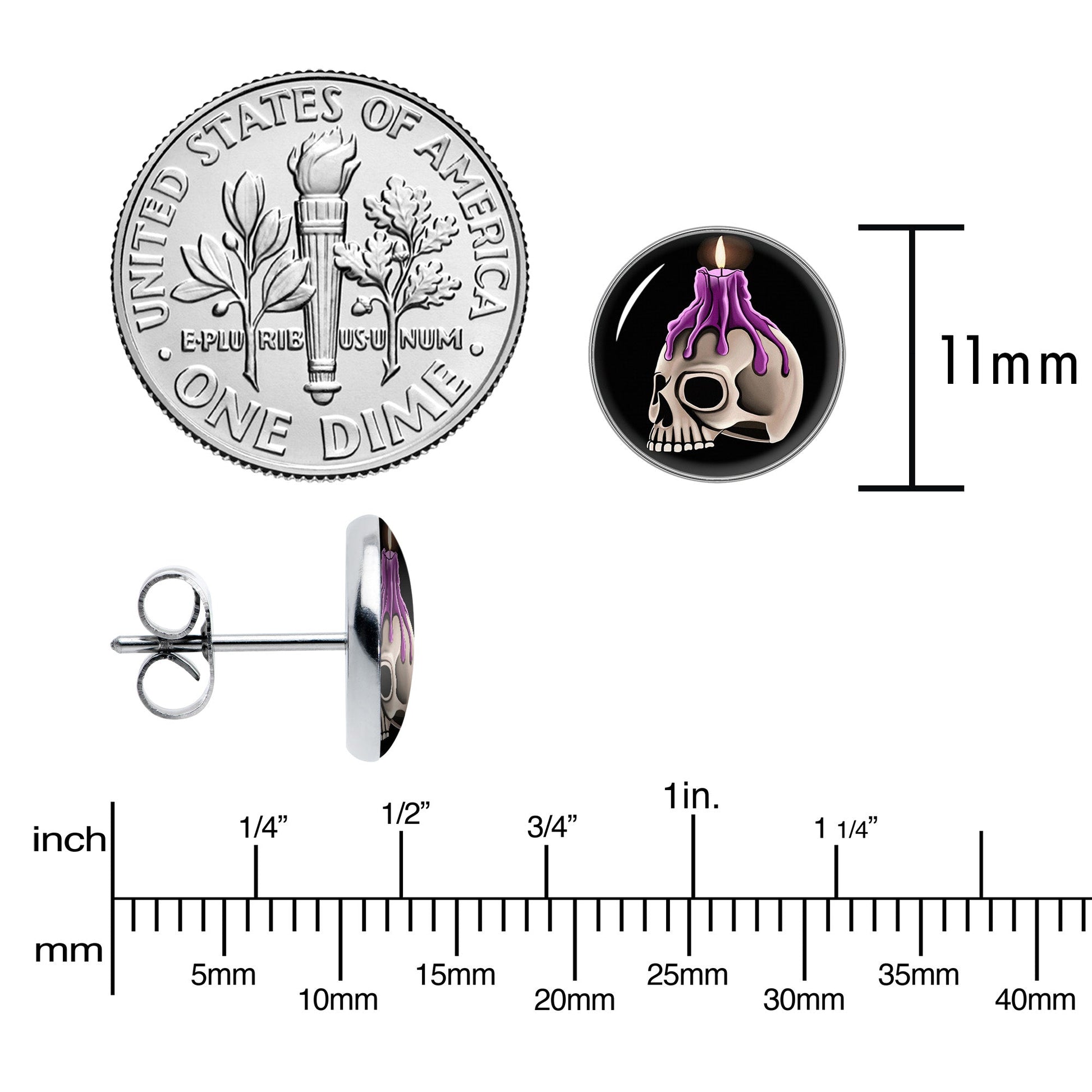 These earrings for pierced ears are totally lit! They're made with stainless steel straight posts with friction backs for a secure fit. They feature disc shaped skull charms. The skulls are embellished with lit purple candles, dripping wax down the skulls. They're further embellished with black backgrounds that really makes the images pop! Let your look cast a haunting spell when you're rocking these gorgeously gothic stud earrings! Sold as a set of two.