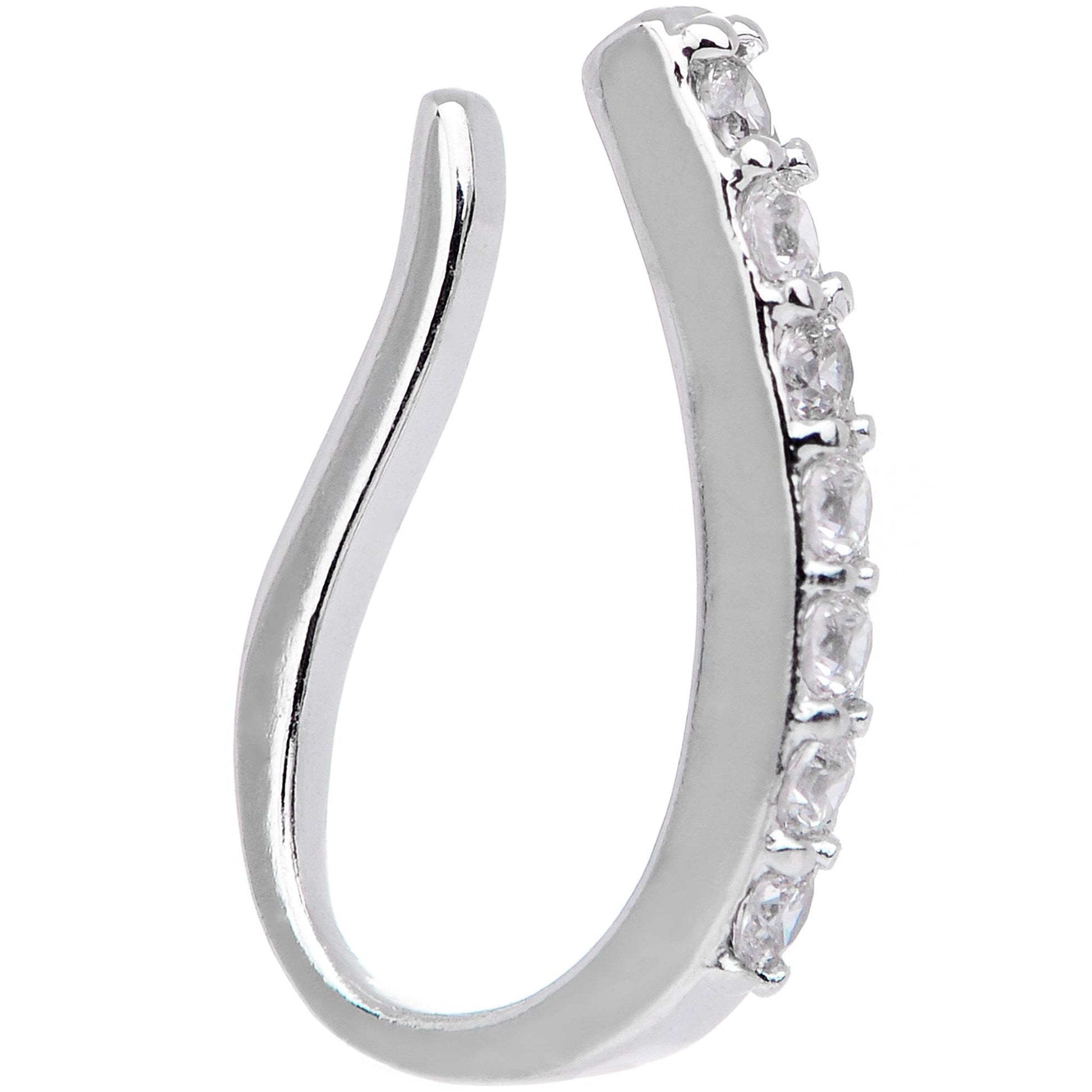 Show the world you love the look of piercings without all the work of actually getting pierced whenever you wear this clip on fake nose jewelry. This nose clip features clear cubic zirconia gems along the outer arc and is adjustable to fit your nose. One size fits most! Whether you don't like the pain or don't want anything permanent this clip on nostril ring for women is perfect for you.