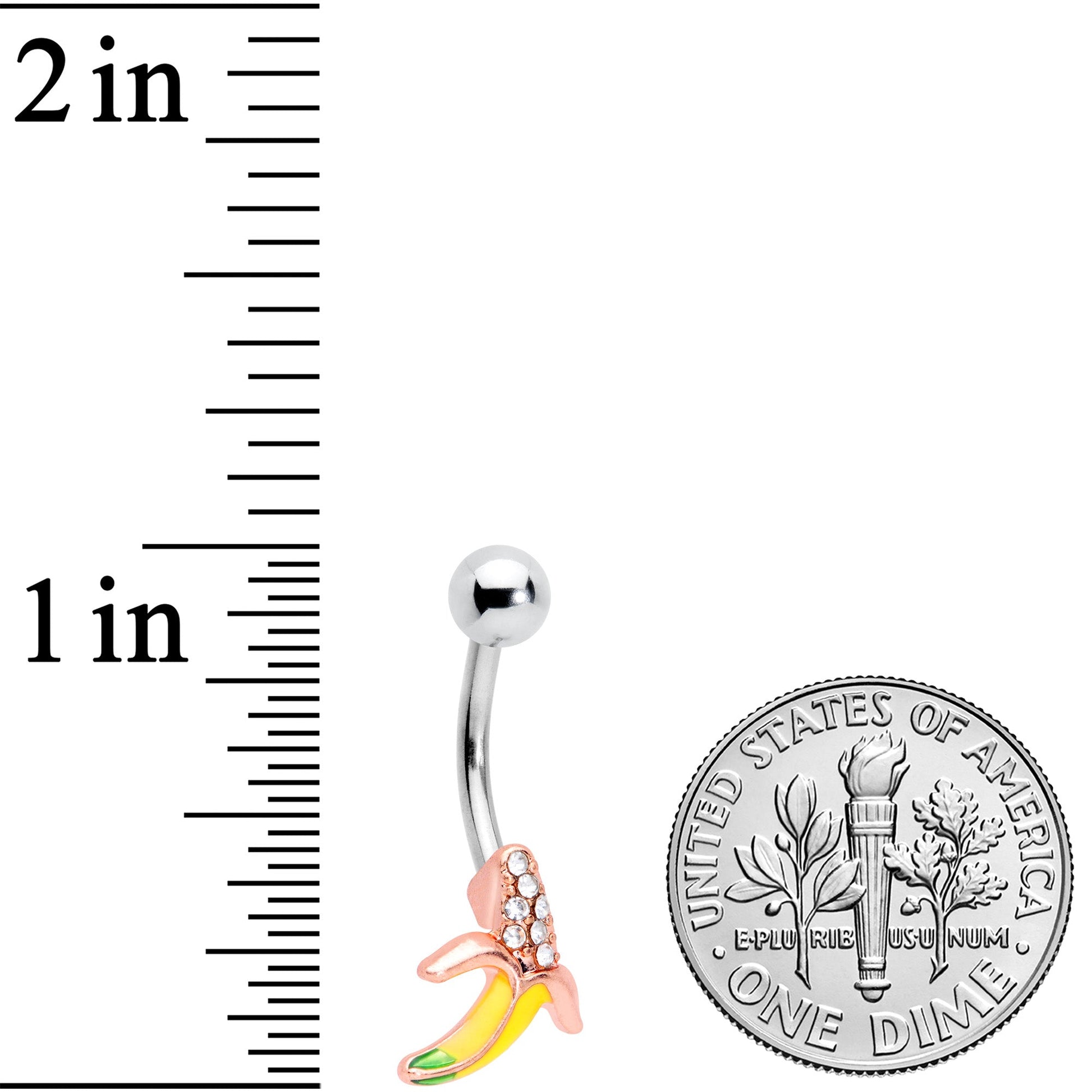 Combine fruit with fashion with this 14 gauge navel ring! It's made with a 3/8" durable 316L surgical grade stainless steel curved barbell with a 5mm top ball end. The bottom end features a banana charm with a realistically yellow peel and a green tip. The top half of the banana is set with small clear cubic zirconia gems for a look that's more posh-looking than it is produce section. With its whimsical style and fanciful detailing, this belly button jewelry is one you're sure to go bananas for!Specifications