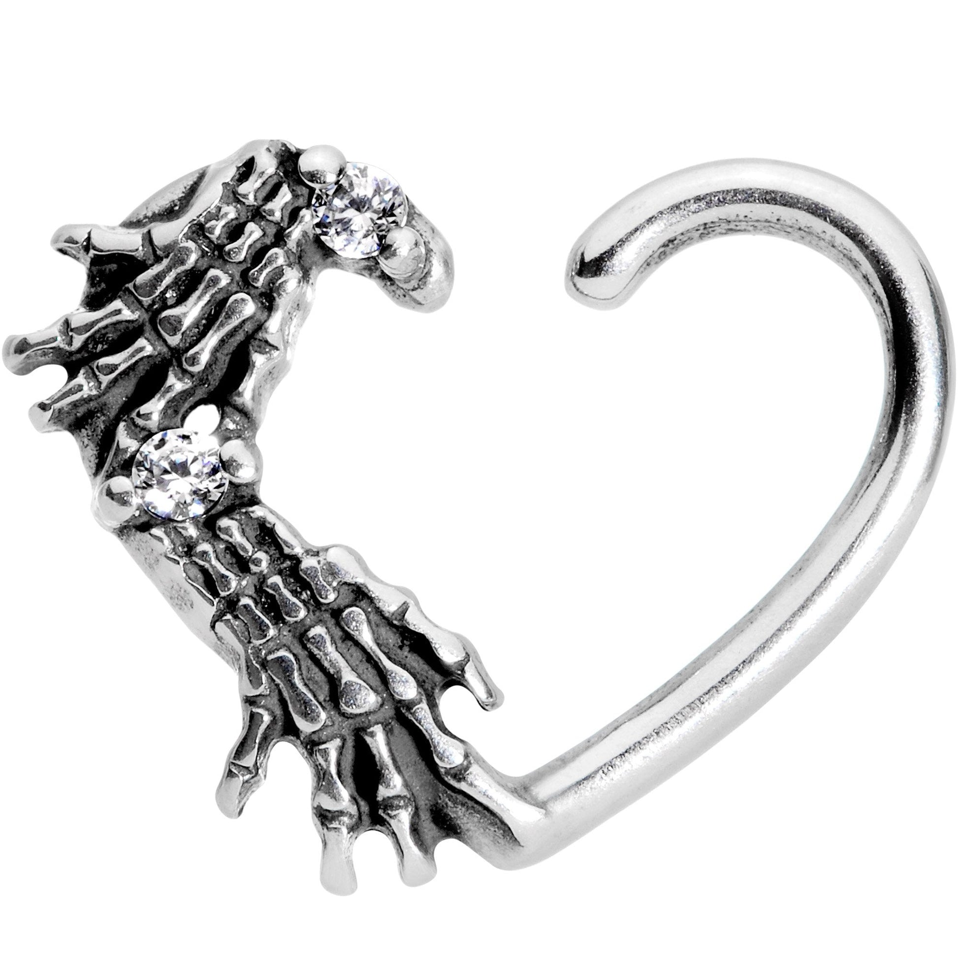 If you're easily scared, stay right there. If you're fond of creepy things, then this cartilage piercing is for you. This heart-shaped seamless circular ring features a pair of skeletal hands encrusted in clear gems. The 10mm closure ring, specifically designed to be worn in the right ear, is made with durable 316L surgical grade stainless steel. Simply twist ends slightly, and gently pull away to insert piercing. This closure ring can also be used for the tragus, helix, cartilage, earlobe and other ear locations. Perfect for Halloween!Specifications