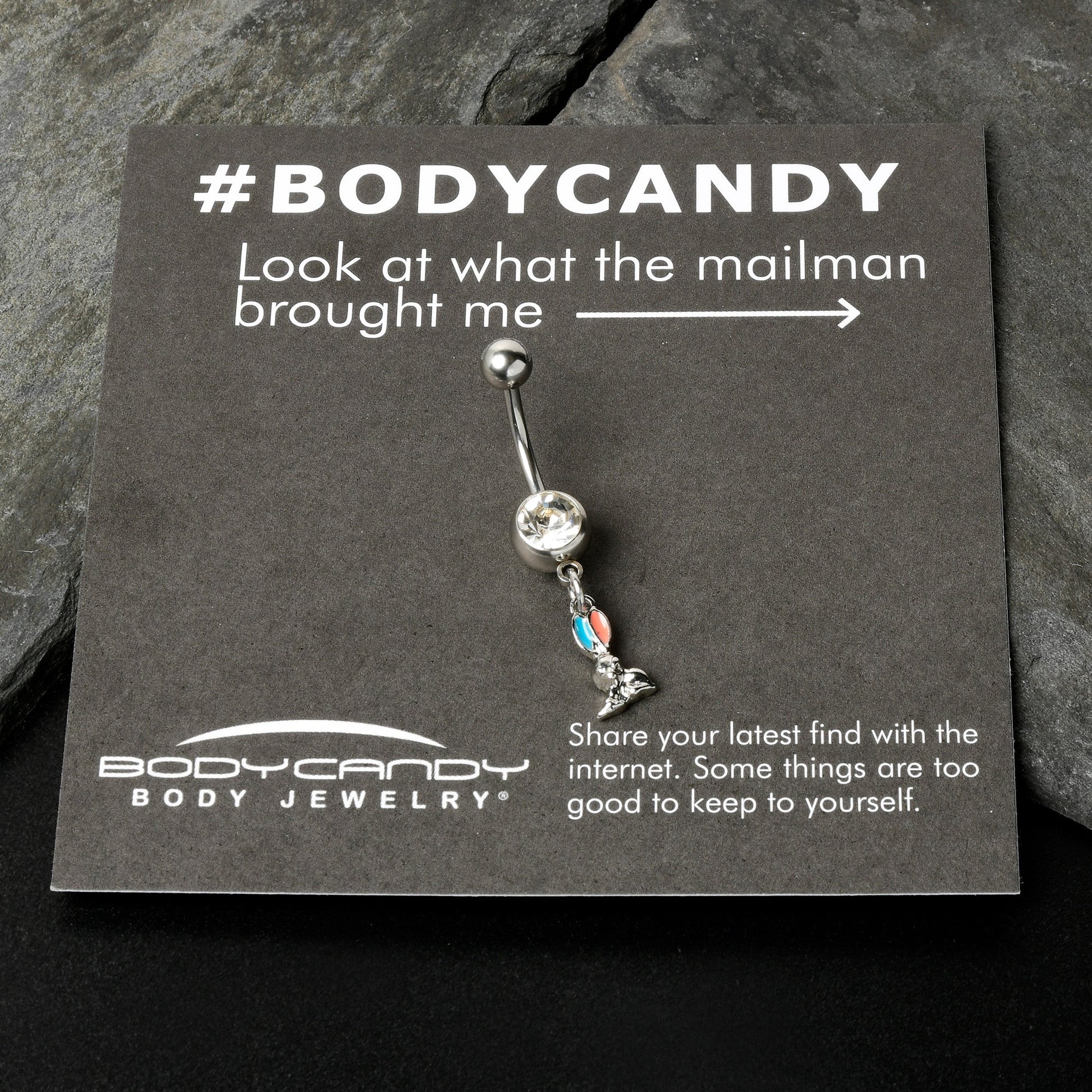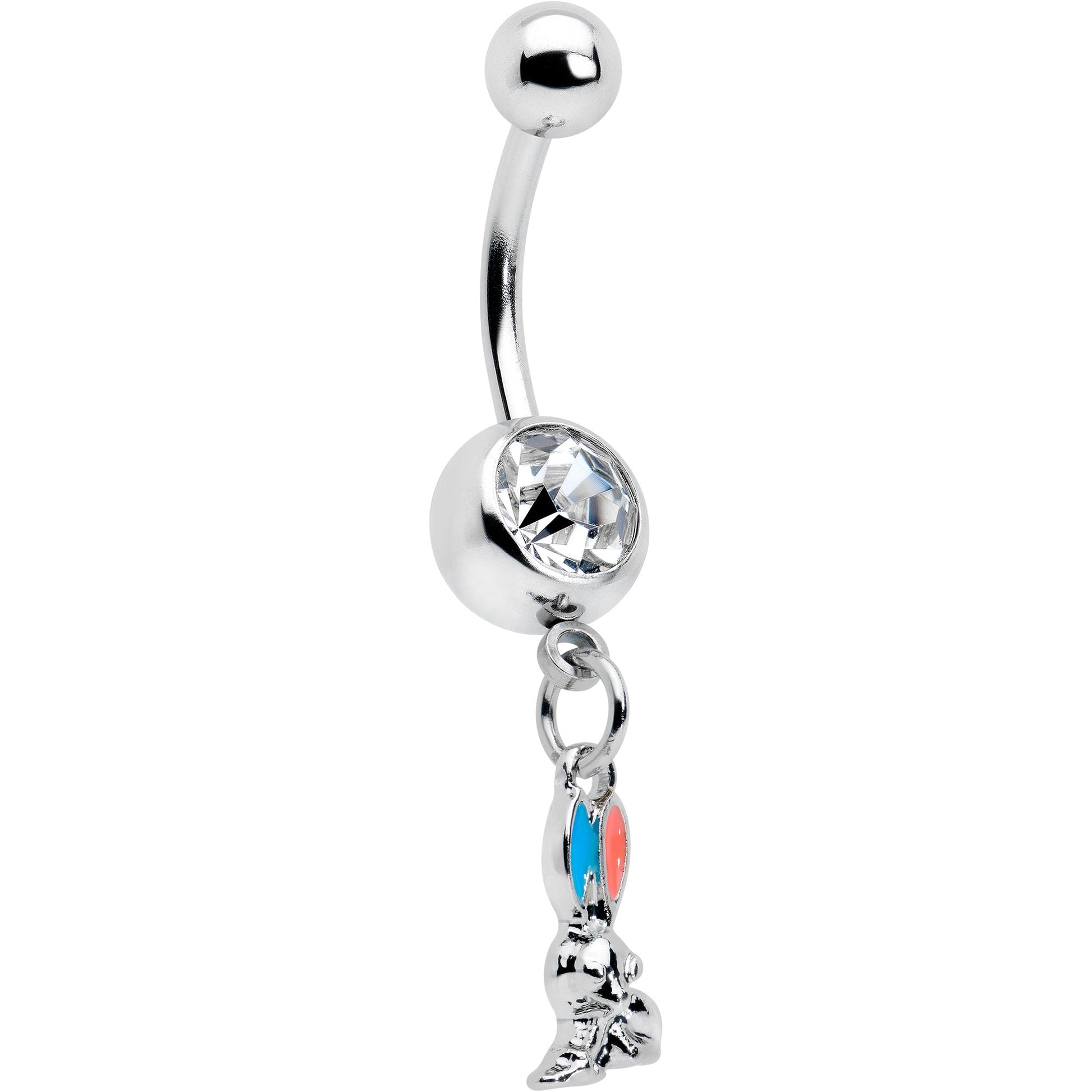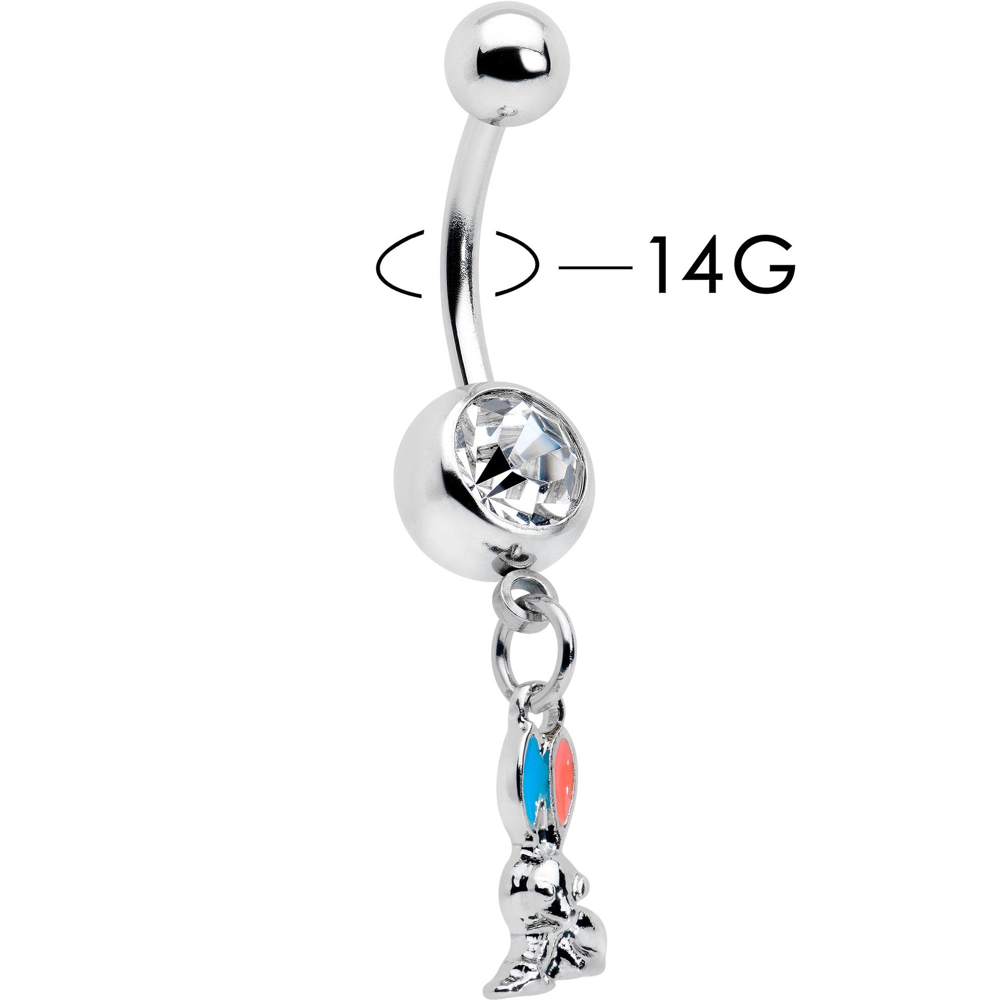 Hop into holiday style with this 14 gauge navel ring! It's made with a 3/8" durable 316L surgical grade stainless steel curved barbell with a 5mm top ball end. The bottom ball end is 8mm and set with a large clear gem. Dangling beneath it is an Easter bunny charm. The bunny is embellished with red inlay in one ear and blue inlay in the other ear, for a festive splash of color you can't ignore. Go down a rabbit hole of color and fashion with this festive Easter belly piercing ring.Specifications