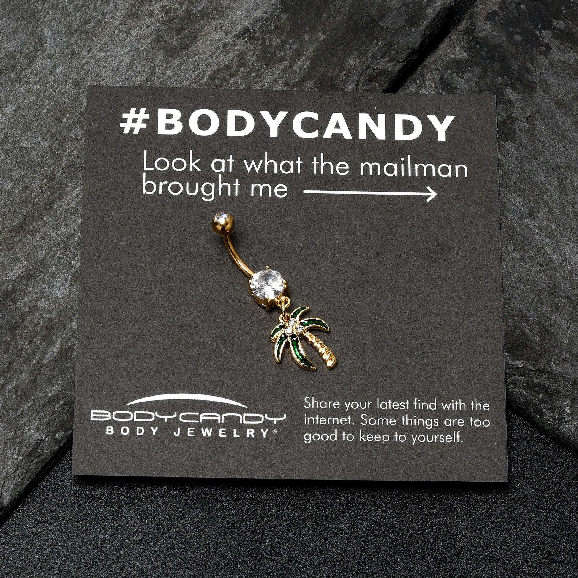 Take a trip to the tropics in total style like on this 14 gauge navel ring. It is made with a 3/8 inch gold tone electroplate over 316L surgical grade stainless steel curved barbell. It has a 5mm top ball end, which is set with a clear gem, while the bottom end is composed of a single clear gem. Dangling beneath it is an elegant palm tree charm. The trunk features textured detailing while the top of the tree is set with clear gems. The leaves feature green inlay for elegant color contrast. Grab your beach towel and sunscreen, it is time to rock a tropical look with this perfect palm tree belly piercing jewelry.Specifications