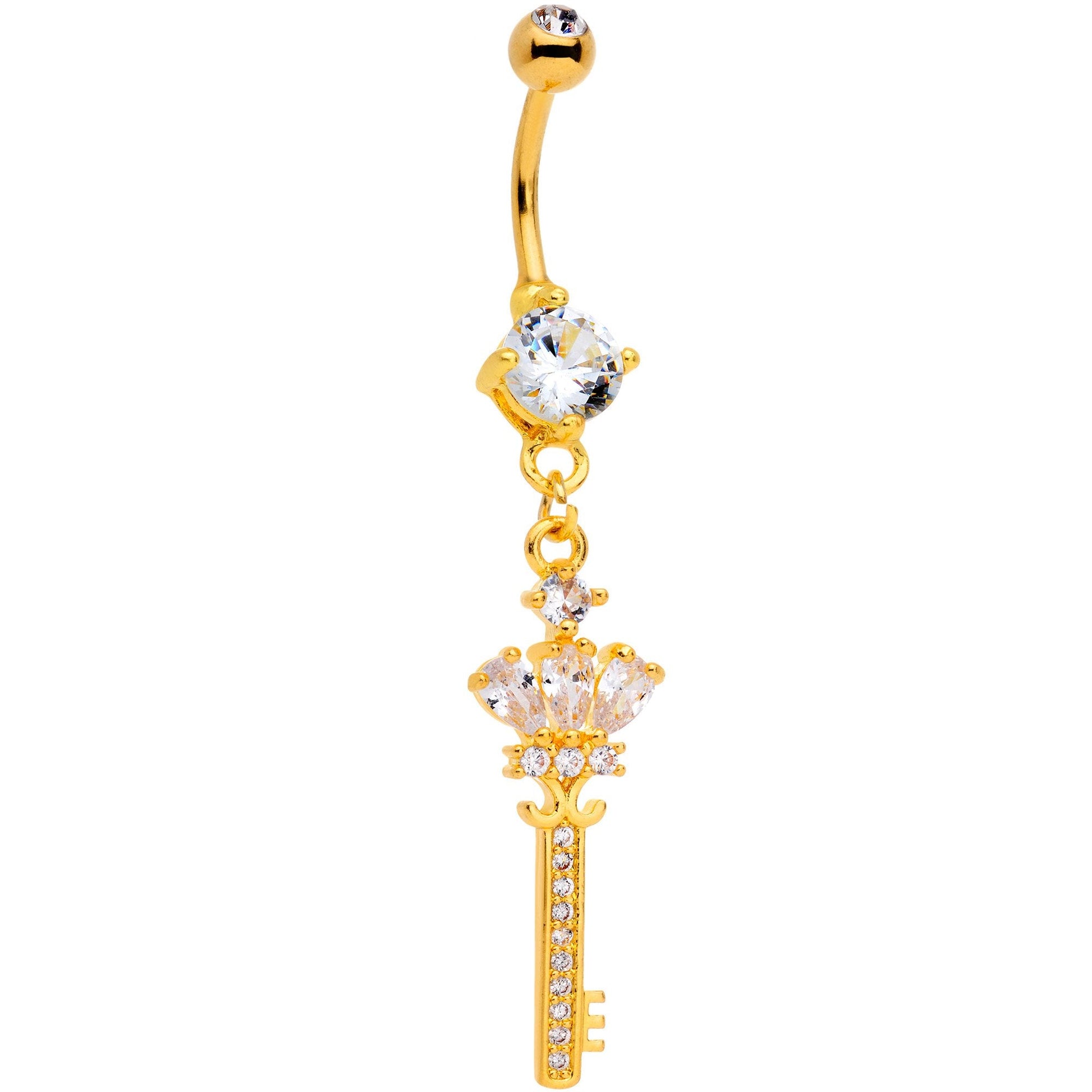 If you like your look locked down with fun fashion then this 14 gauge belly button ring is worth a peek. Made with a 7/16" gold tone anodized over 316L surgical grade stainless steel curved barbell, this navel ring features clear top and bottom gems as well as a key dangle charm set with clear gems.Specifications