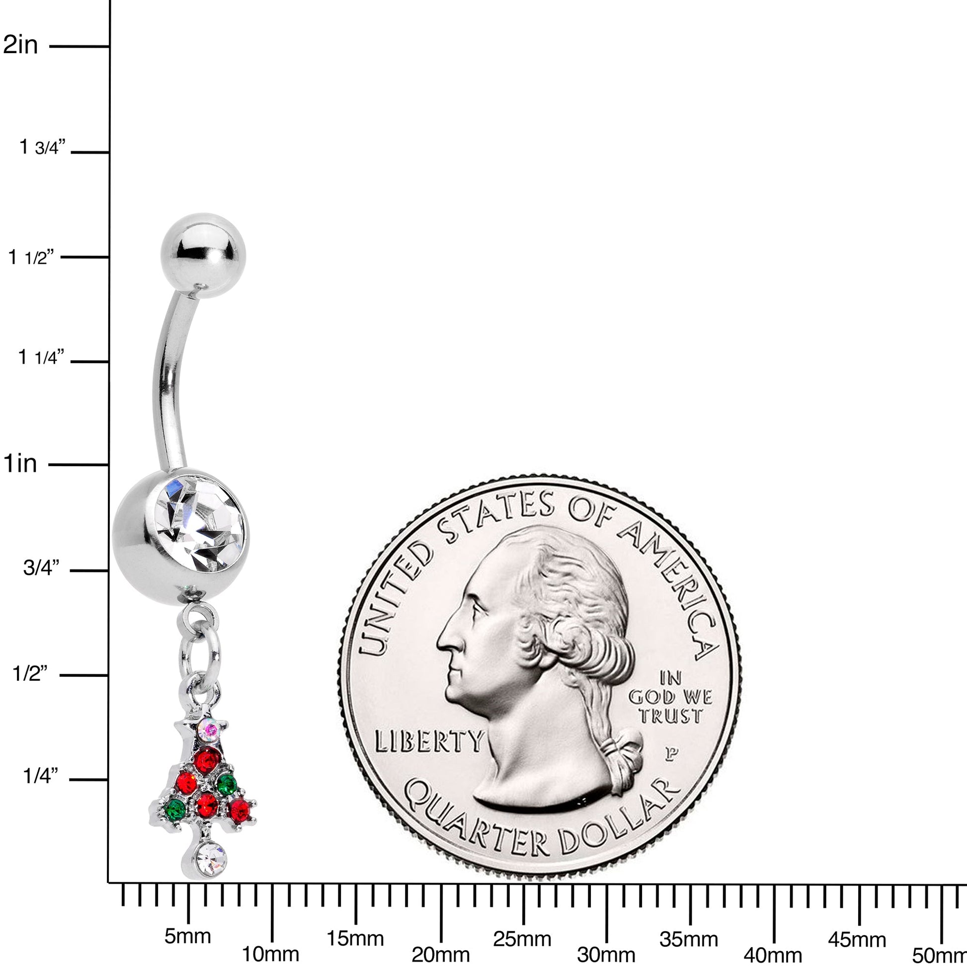 The Christmas tree on this 14 gauge navel ring is all decked out and ready to celebrate! It's made with a 7/16" durable 316L surgical grade stainless steel curved barbell with a 5mm top ball end. The bottom ball end is 8mm and set with a large clear gem. Dangling beneath it is a Christmas tree charm paved in red and green gems for a holiday feel. The tree is set at the base with a tiny clear gem too! Get ready to celebrate in colorful style this holiday season when you give your navel piercing a gift of its own - this charmingly cheerful Christmas belly button ring!Specifications