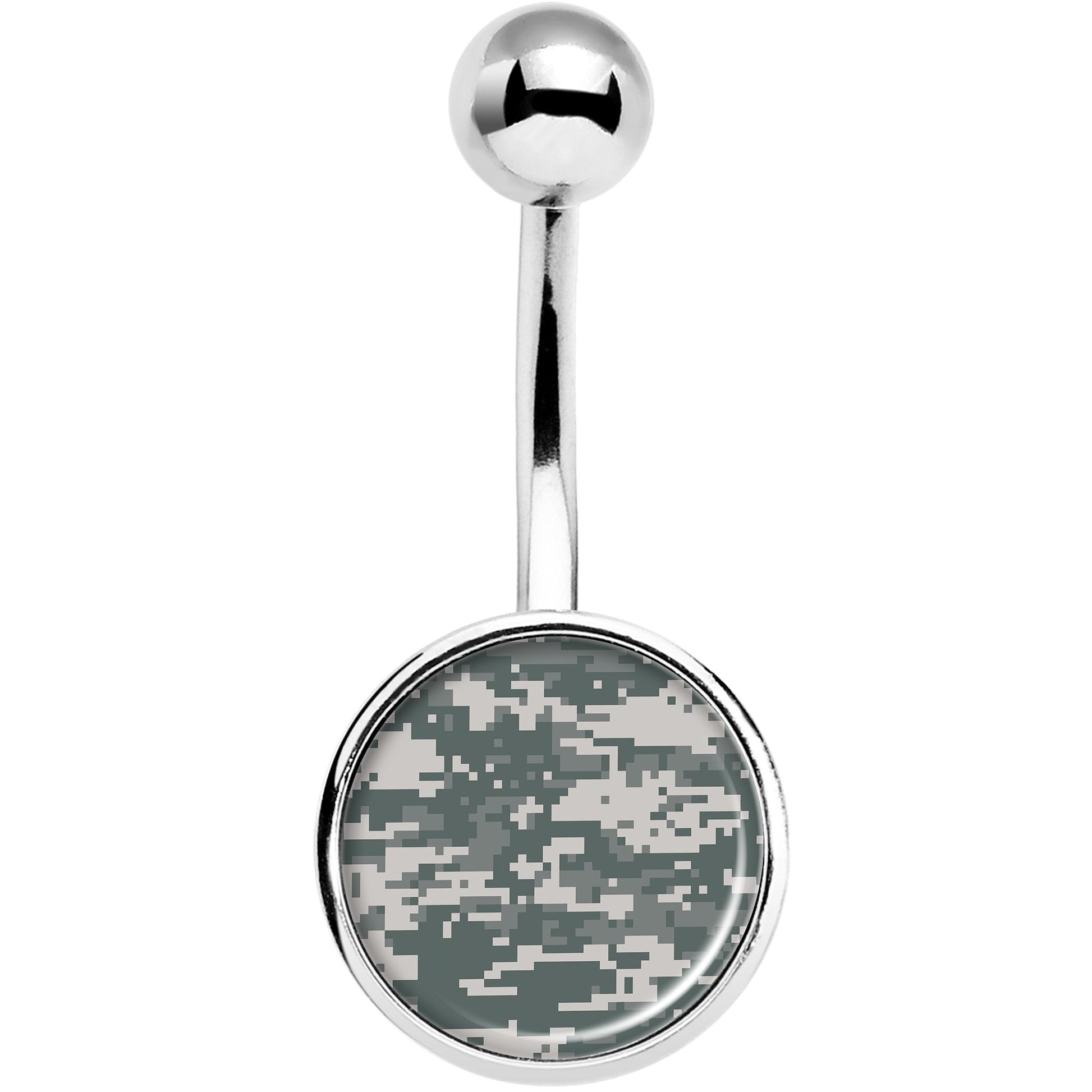 If you love a contemporary digital camo pattern then this 14 gauge belly button ring is right for you! Made with a 7/16" durable 316L surgical grade stainless steel curved barbell, this navel ring features a logo inlay bottom charm.
