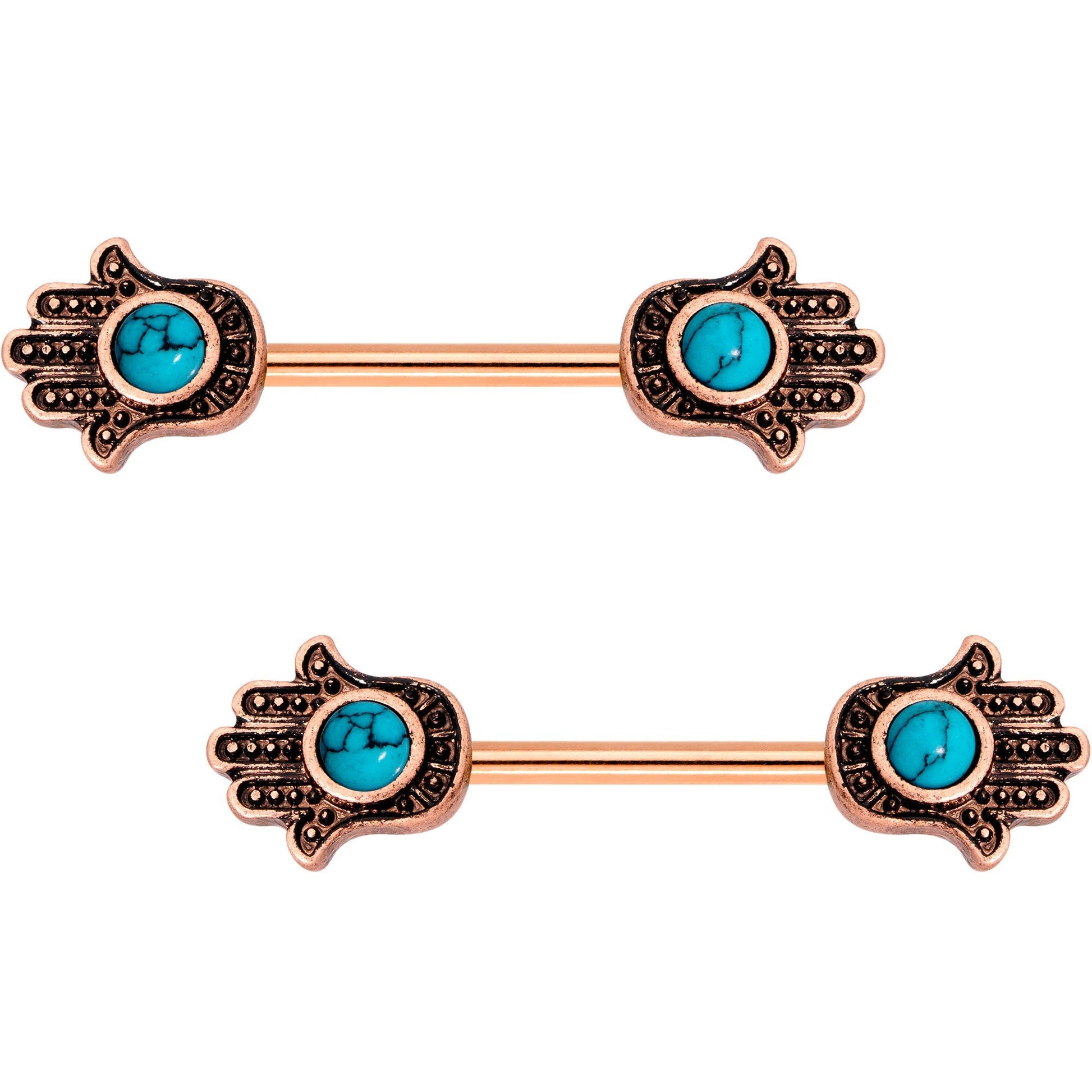 Faux Turquoise Rose Gold Tone Hamsa Hand Barbell Nipple Ring Set