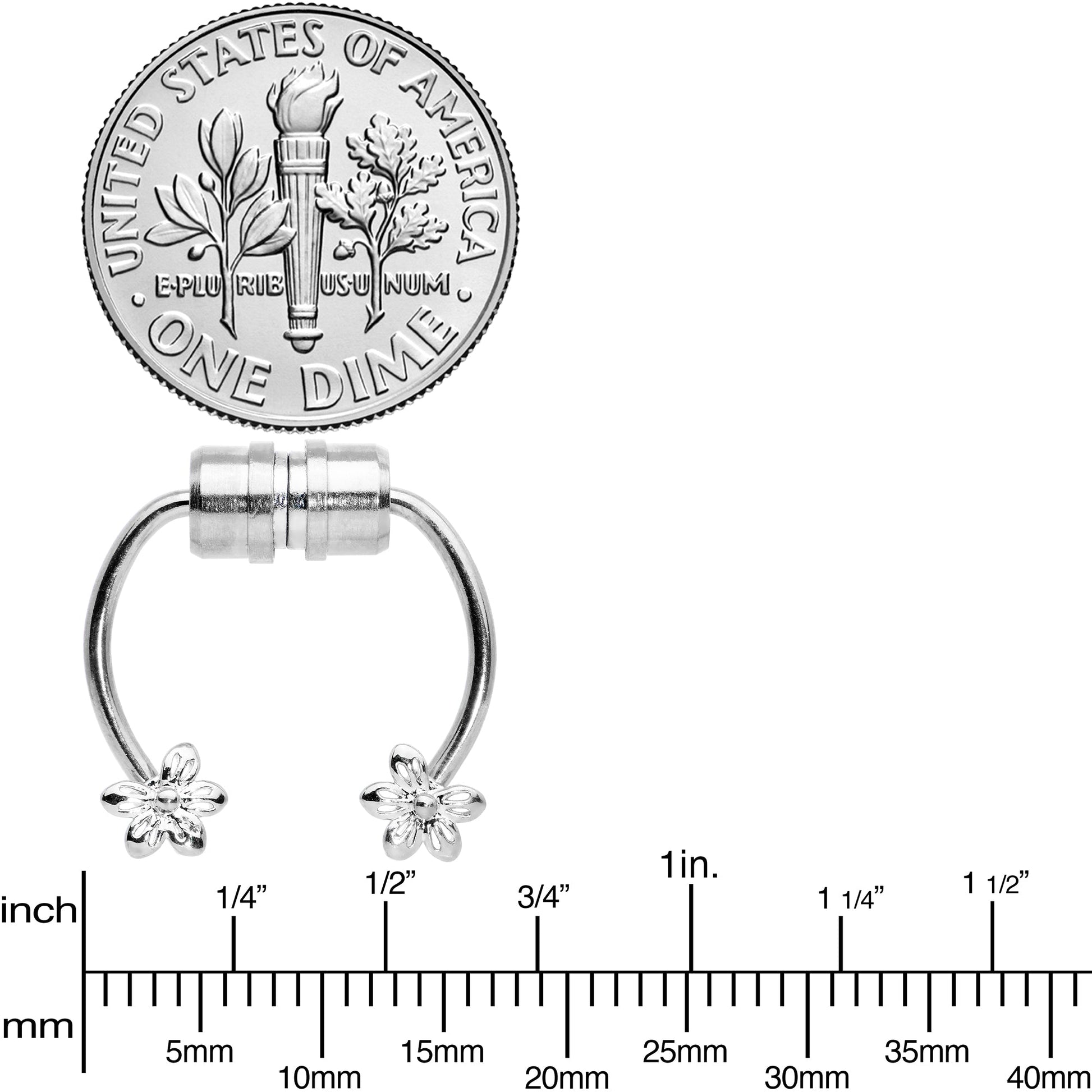 If you like the look but aren't ready to commit yet, this faux septum jewelry is perfect for you! It features a pair of magnets to hold it securely in place without the need of a trip to the piercer. It features flower charm ends for a stylish and elegant look. Try out a new look before you commit with this magnetic faux septum jewelry!Specifications