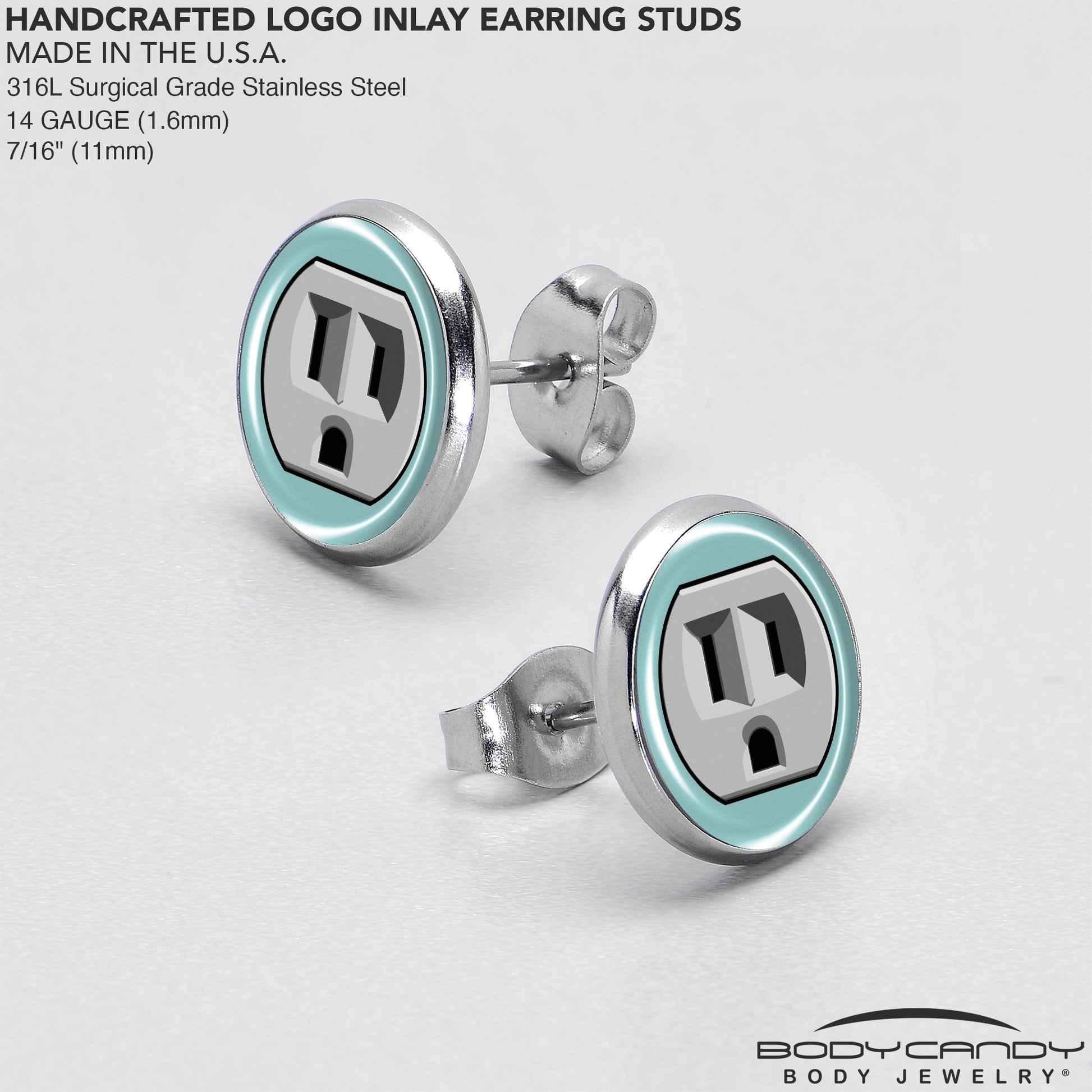 If you're not feeling plugged in and you're ready to power down, let the world know with these stud earrings for pierced lobes. They're made with stainless steel straight posts with friction backs for a secure fit. Each one features a grey electrical outlet on a blue background. The sockets in the outlet appear to be making a frowny face for days when your power is low. Feel the frown on these charming earrings. Sold as a set of two.
