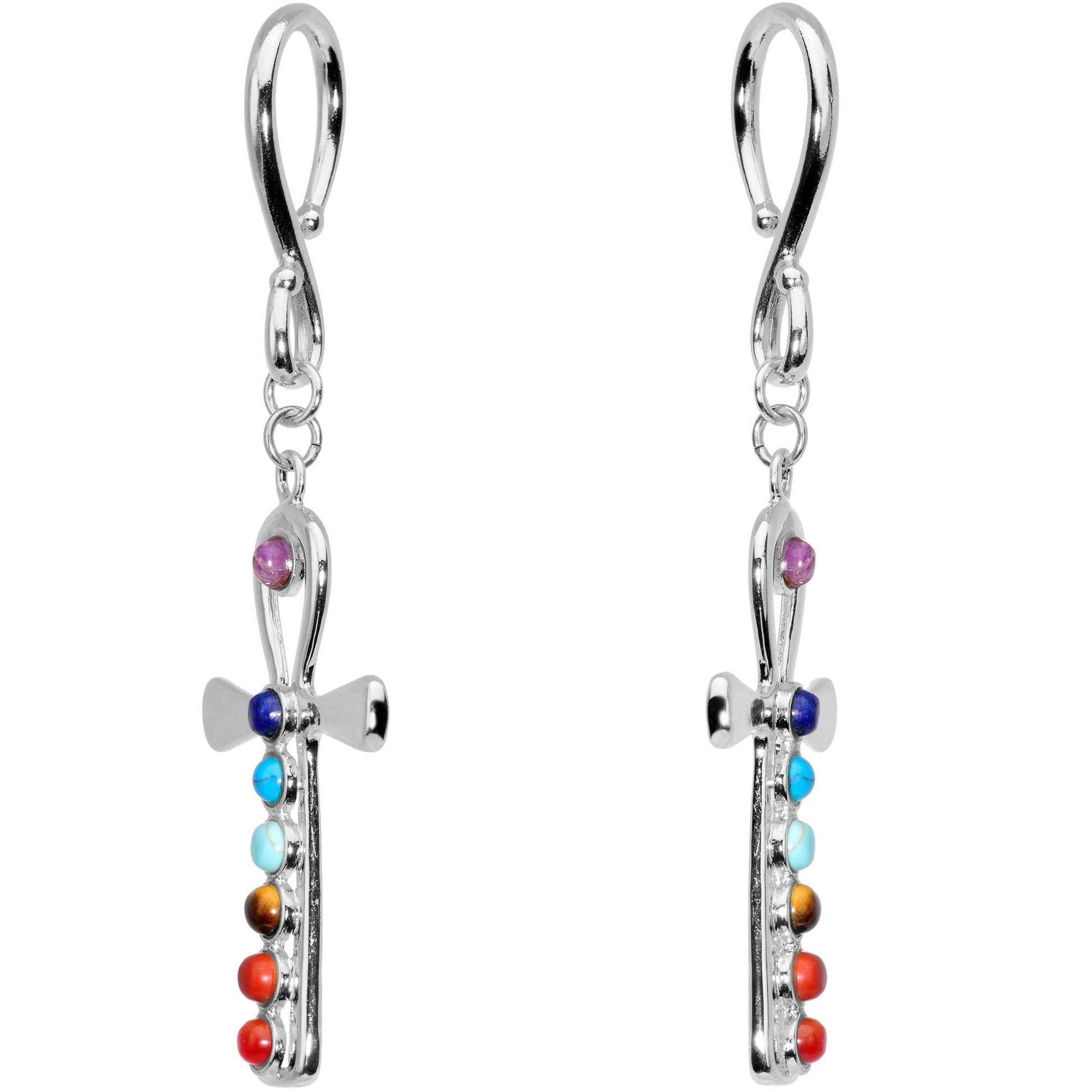 Embrace your inner balance while getting in touch with your outer beauty when you wear this pair of handcrafted dangle tunnel plug earrings. Made with durable 316L surgical grade stainless steel hook backings, these stretched ear hangers require an 8 gauge minimum size, can be worn alone or with tunnel plugs, and feature Egyptian ankh dangle charms set with color accents that align with the chakras. With a total length of 89mm and a weight of .63oz, these ear weights are handmade in the USA and are sold as a set of two for you.Specifications