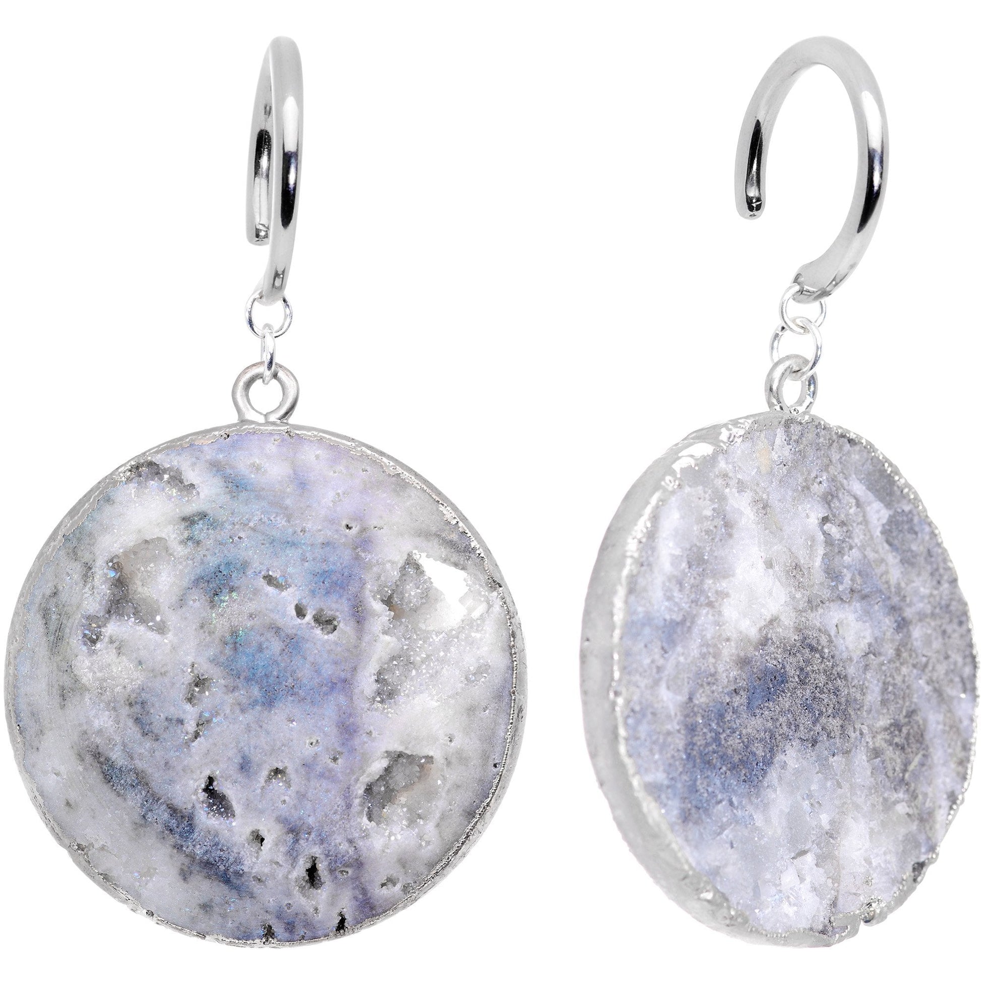 If you dream of the white and silver hues of winter all year 'round then this pair of handcrafted dangle tunnel plug earrings will make you feel like a snow queen. Made with durable 316L surgical grade stainless steel hook backings, these stretched ear hangers require a 10 gauge minimum size, can be worn alone or with tunnel plugs, and are made with natural druzy quartz stone discs that capture all of the beautiful shades of a Buffalo winter! With a total length of 58mm and a weight of 1.6oz, these natural stone ear weights are handmade in the USA and are sold as a set of two for you.Specifications