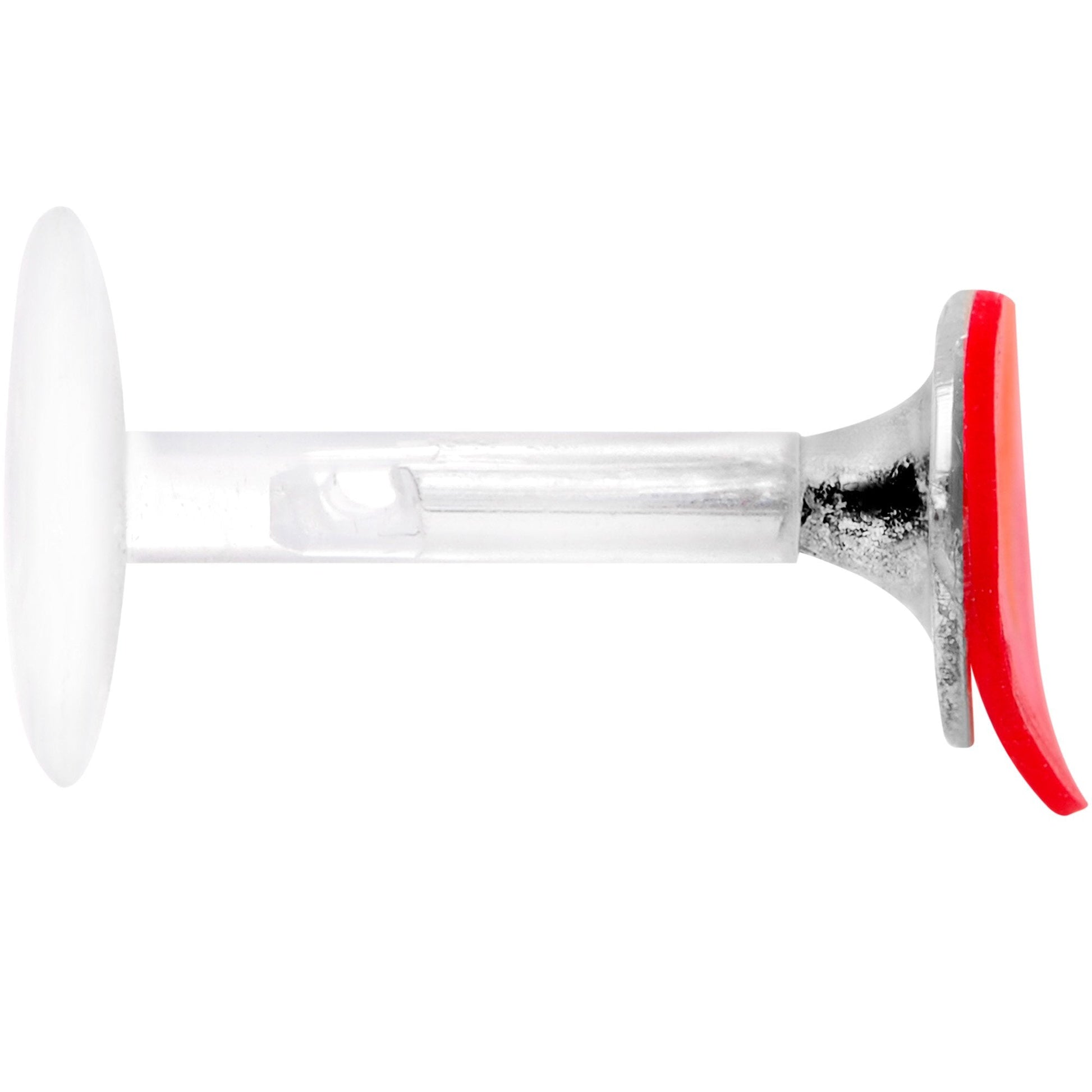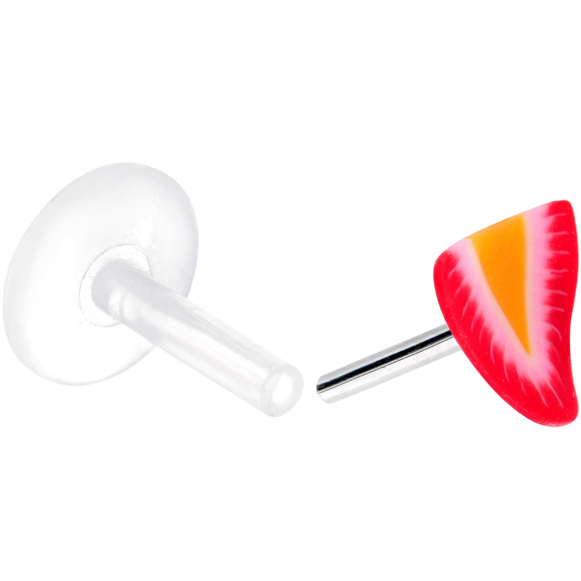 Feeling a little floral today? Check out this 16 gauge tragus cartilage earring with multiple sized backings. Made with clear Bioplast, this cartilage piercing features a cut red strawberry end and comes with a 6mm Biolplast flat backing as well as an 8mm Biolplast flat backing to fit your piercing comfortably. This tragus jewelry can be worn in a variety of cartilage earrings including your tragus and more and is handcrafted in the USA.Specifications