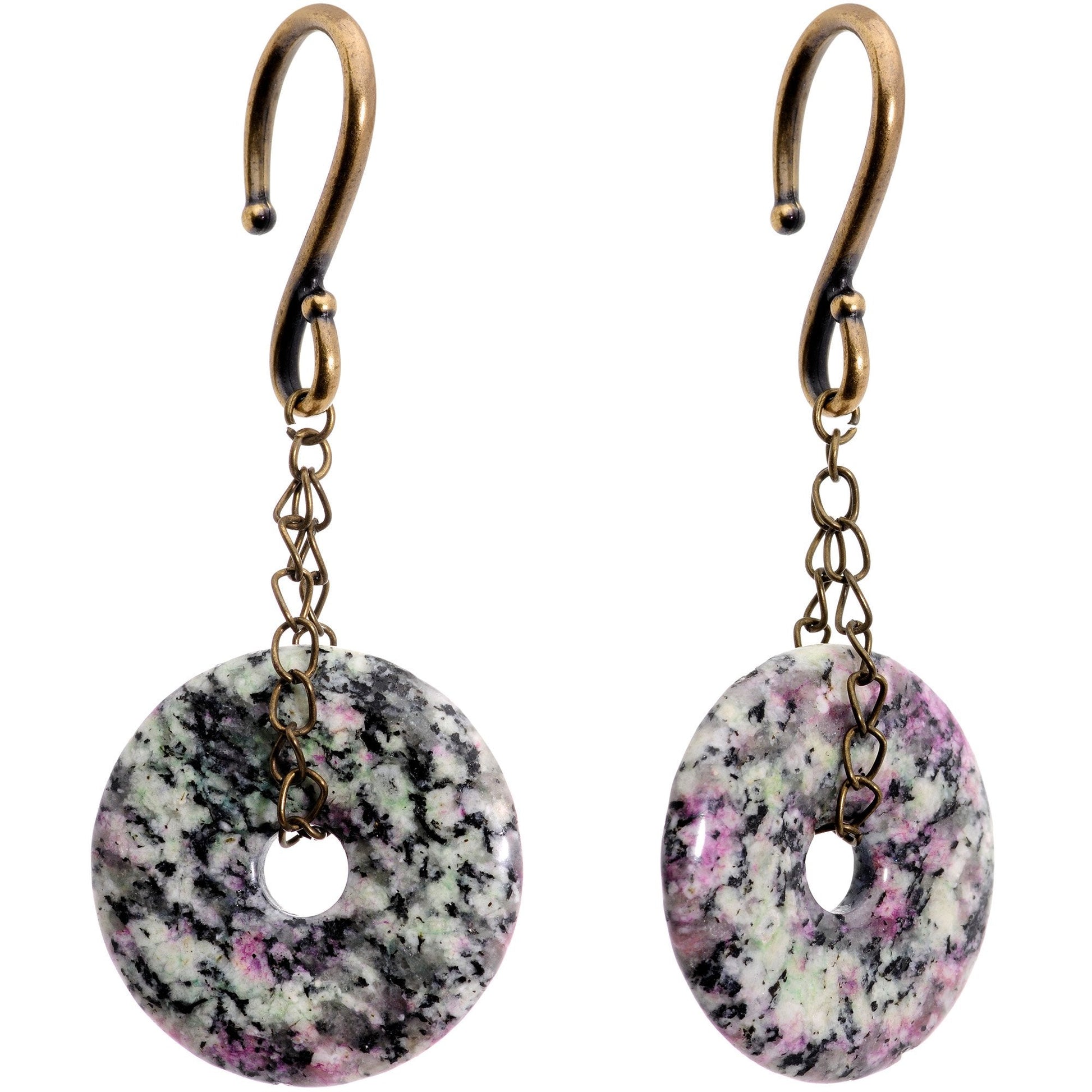 Mmmmmm........donuts! These elegant tunnel plug earrings are made with antique brass plated over base metal hook backings, require a minimum 8 gauge piercing size, and can be worn alone but could also be worn with a pair of very short tunnel plugs. These hanger plug earrings feature 1 3/8" wide donut-shaped weights made of natural zoisite stone, supported by a length of chain that allows the stones to swing freely. The stone itself is a unique blend of red and greens, mottled in abstract patterns that will be different for each individual stone weight. They each have a total length of 84mm and weight of .49oz each. You're not going to let anyone dunk these donuts in their coffee!! And they're handcrafted in the USA! Sold as a set of two.Specifications