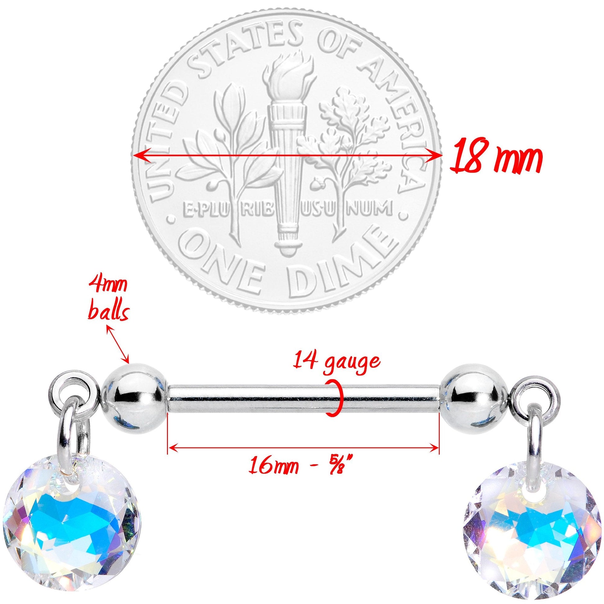 These 14 gauge nipple piercings contain such a complex color that you could easily mistake them for the Northern Lights! They're made with 5/8" durable 316L surgical grade stainless steel straight barbells. At each end, there's an aurora crystal with a faceted circular shape to best display the color shift within, all created with crystals. Whether it's the hot sunlight of a beach or the soft light of a bedroom lamp, with this nipple jewelry you'll be sure to outshine everything else around you. And they're handcrafted in the USA! Sold as a set of two.Specifications