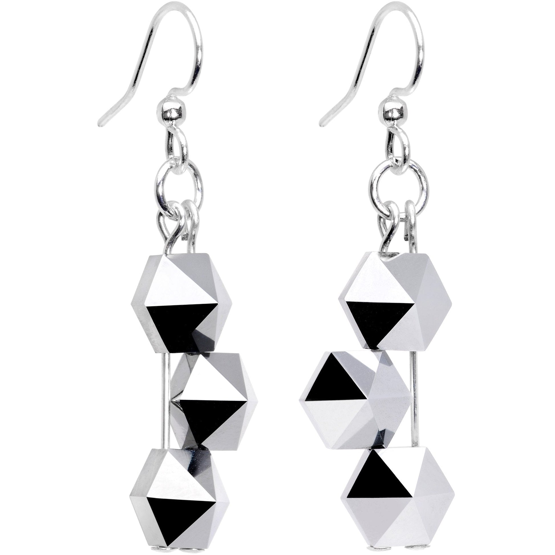 Are you a fan of geometric shapes and mathematical principles that translate into unique body jewelry styles? Check out these raised geometric jumble dangle earrings created with Swarovksi crystal charms. Made with silver plated fishhook earwires, these earrings pair conventional style with a modern flair and are handcrafted in the USA!Specifications