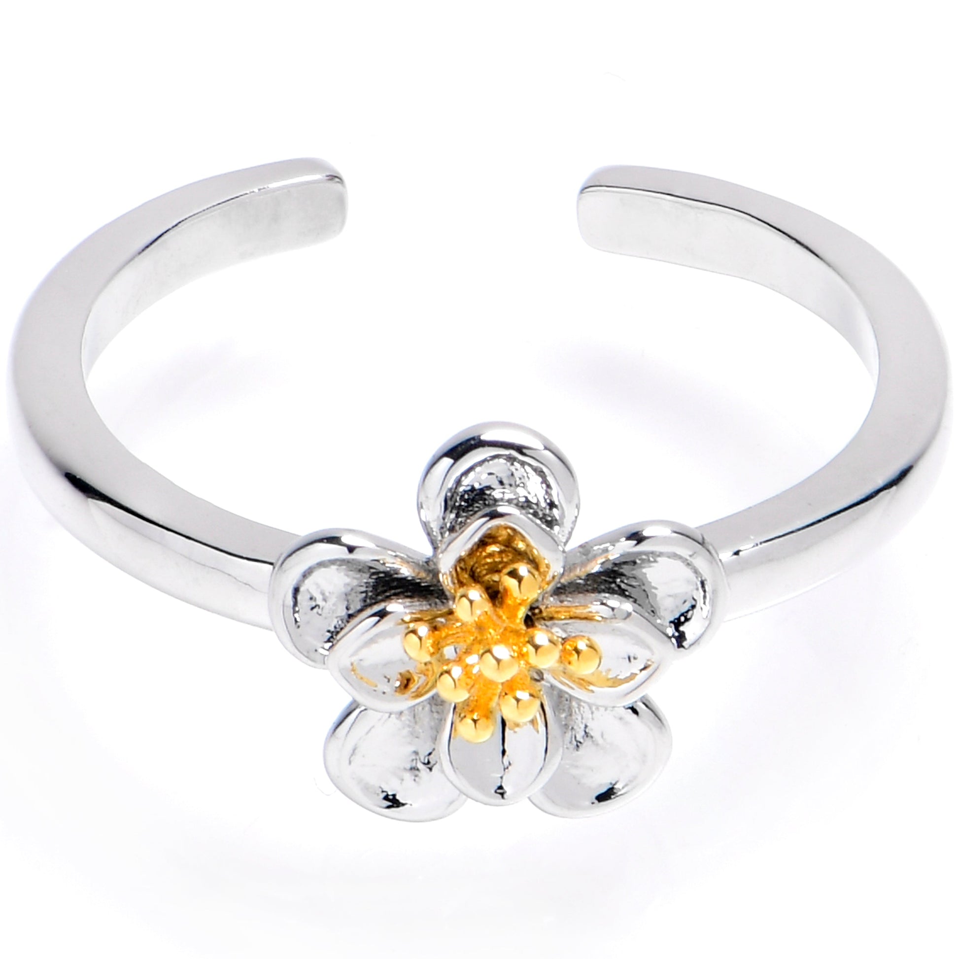 Get centered and prepare for floral fashion with this fabulous foot jewelry. Elevate your pedicure to a whole new level with our Adjustable Toe Ring, meticulously designed to accentuate the natural beauty of your feet and ensuring a perfect and comfortable fit. Its timeless design ensures it pairs seamlessly with any footwear, from sandals to sneakers, making it a must-have addition to your jewelry collection. It features a flower charm with a classic and simple design and a contrasting center.Specifications