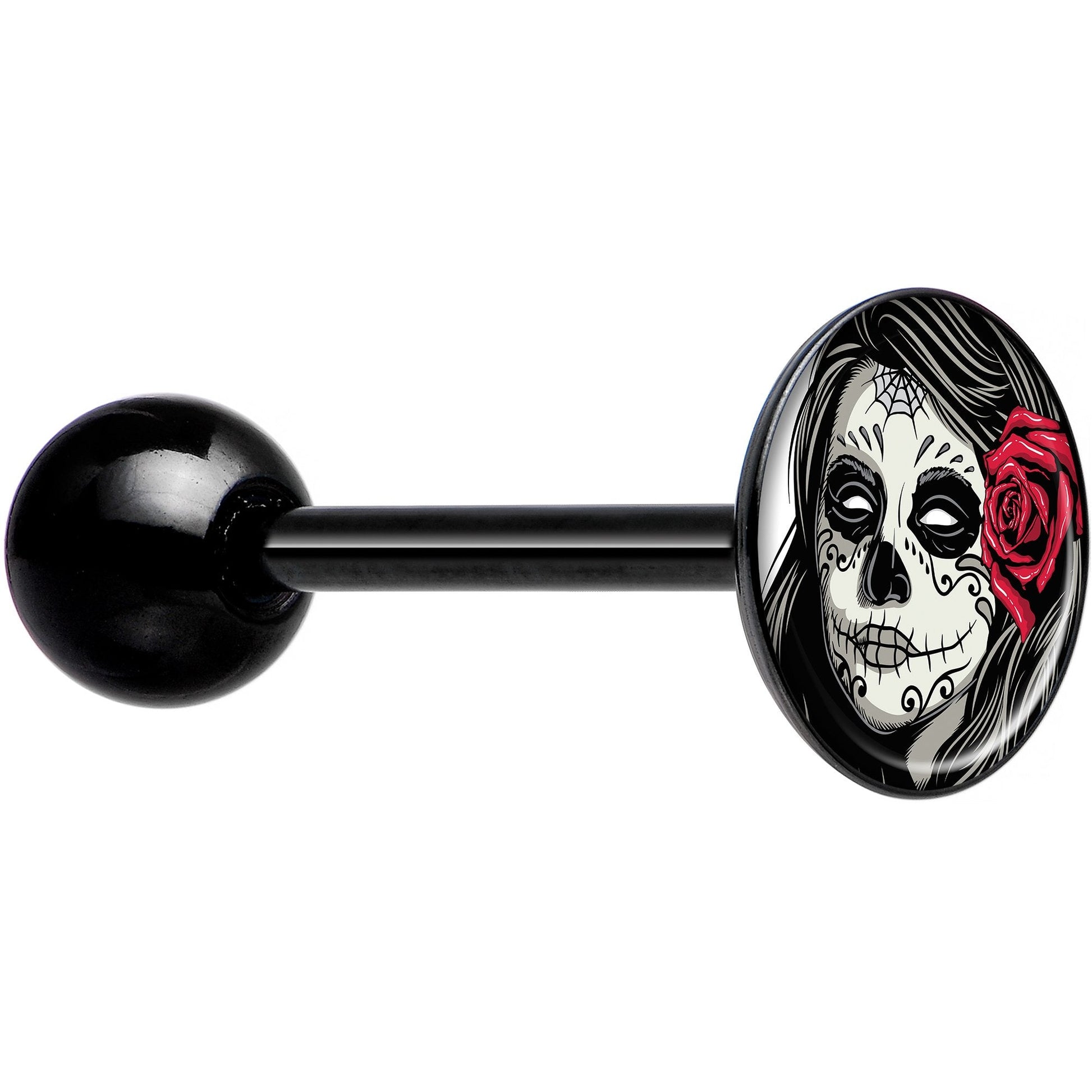 Katrina Sugar Skull with Rose Flower Black Barbell Tongue Ring