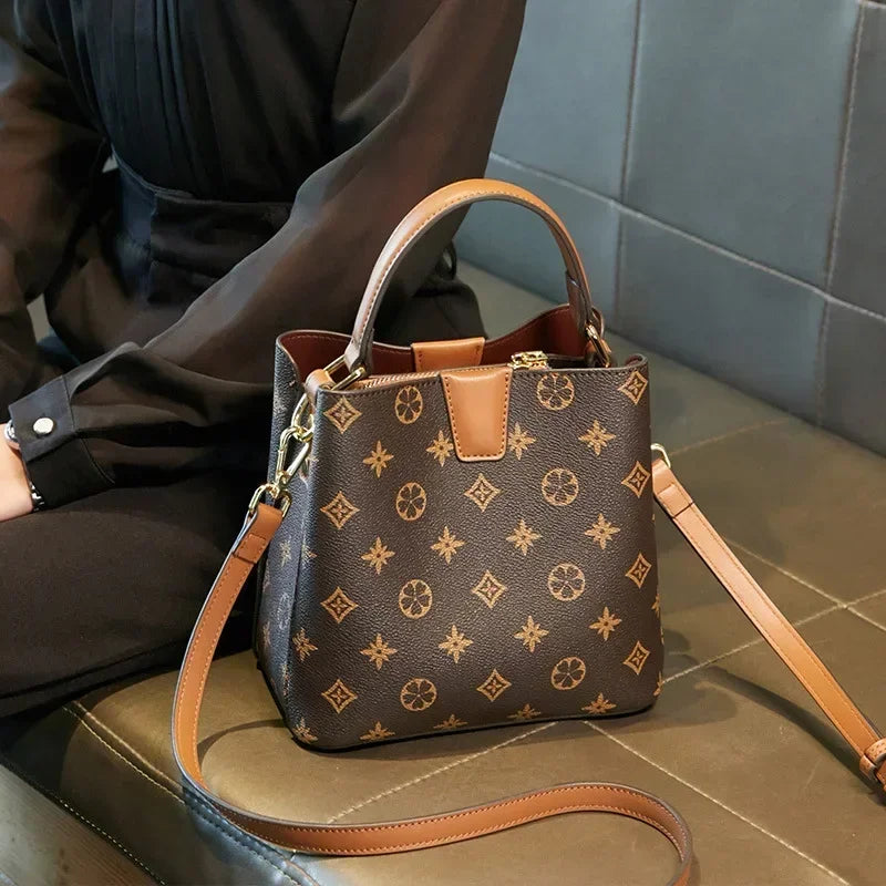 The interior is thoughtfully organized with an interior slot pocket, cell phone pocket, interior zipper pocket, and interior compartment, ensuring all your essentials are neatly stored. With a comfortable single handle/strap and a chic bucket shape, this versatile bag is ideal for travel or any occasion, blending luxury fashion with practical design for women.