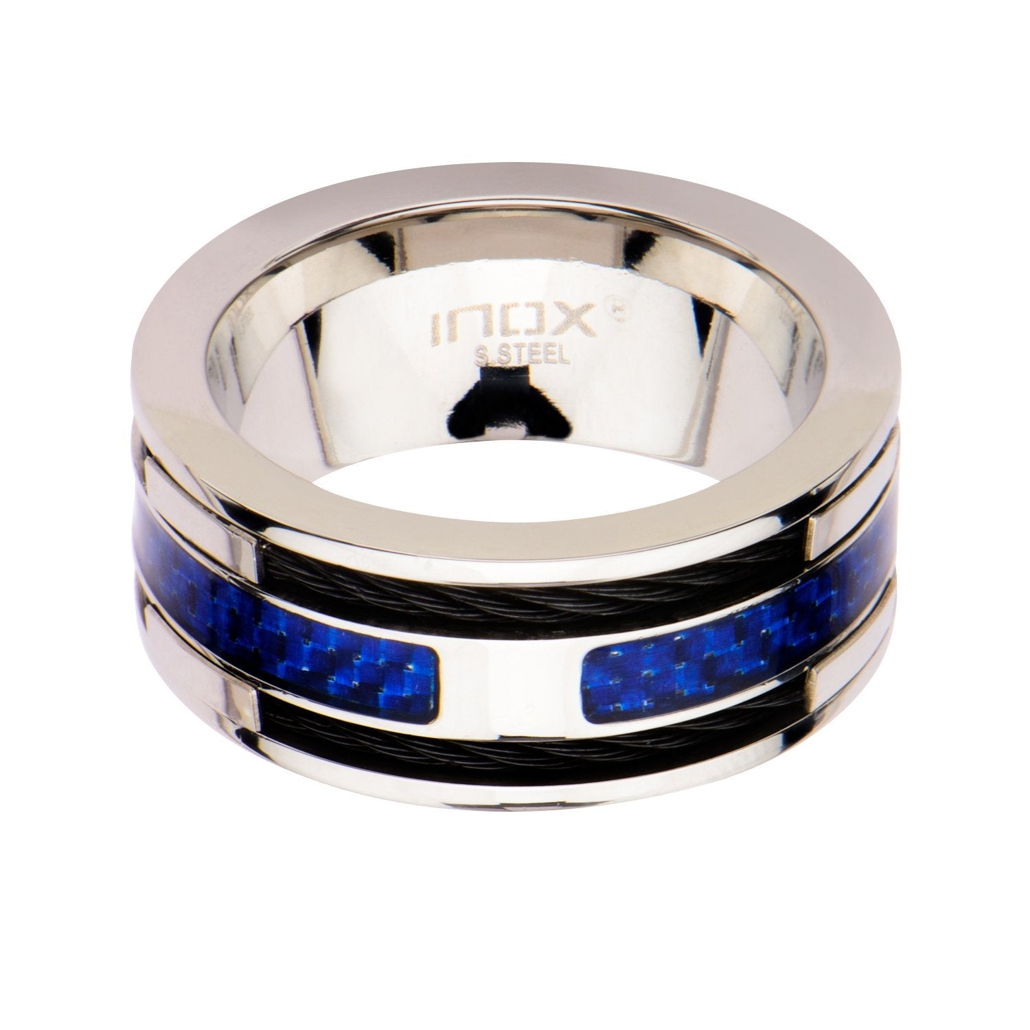Mens Blue Carbon Fiber with Black Cable Steel Inlayed Stainless Steel Ring