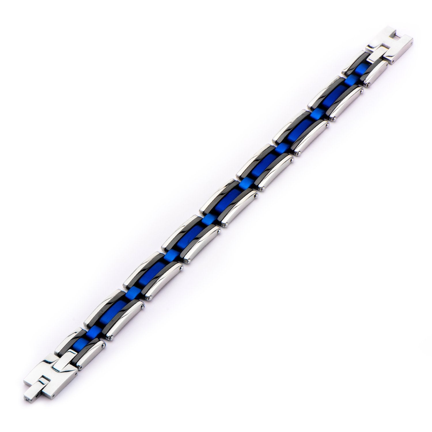 Men's stainless steel bracelet featuring fold over closure. This 12.7mm bracelet features a black and blue color design.